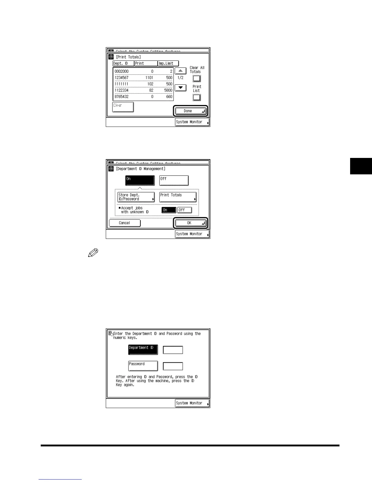 When you select “On,” Department ID Management is enabled. (See ‘Entering the