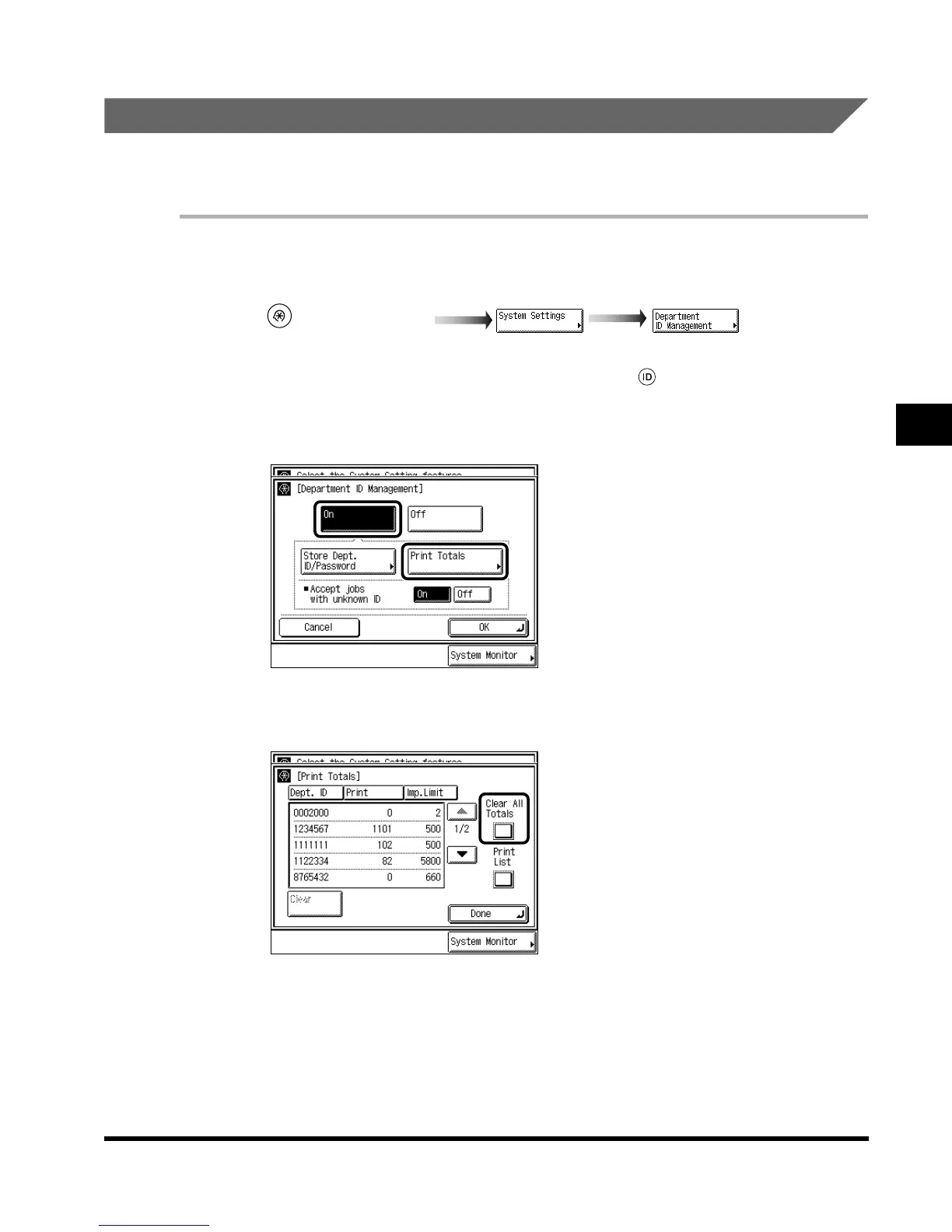 To delete one print total at a time, press “▼” or “▲” to display the desired department, and