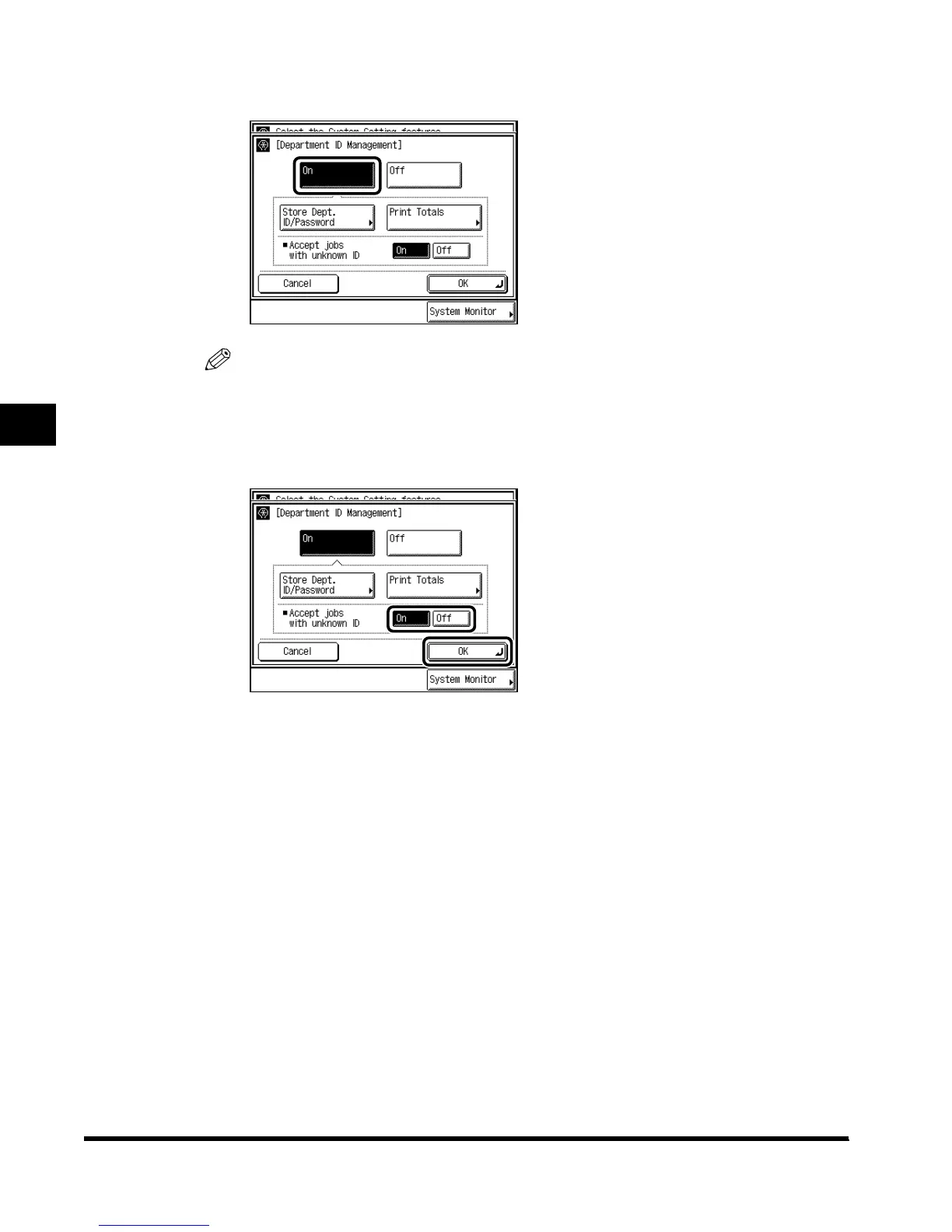 When you select “On,” Department ID is enabled. (See ‘Entering the Department ID and
