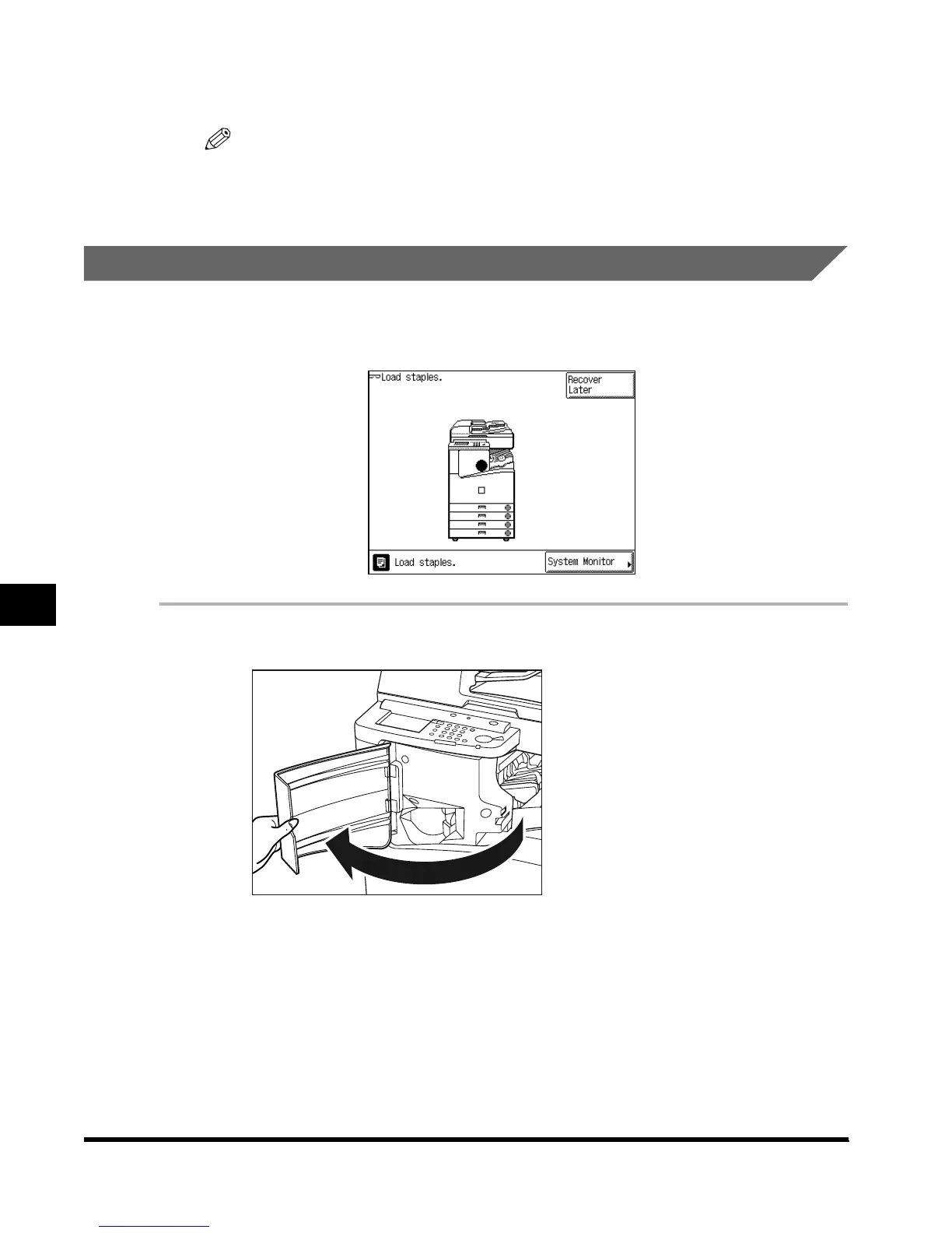 When the finisher is almost out of staples and the staple case must be replaced, a display