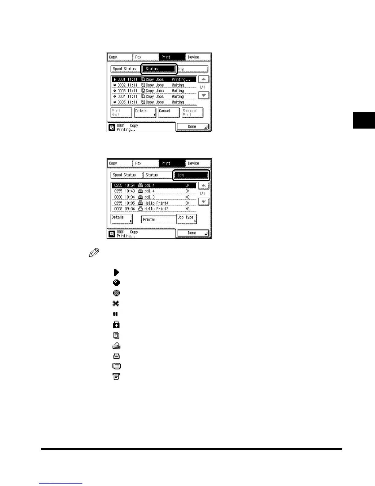 The latest 128 copy or print jobs, or 40 fax jobs are displayed in the log.