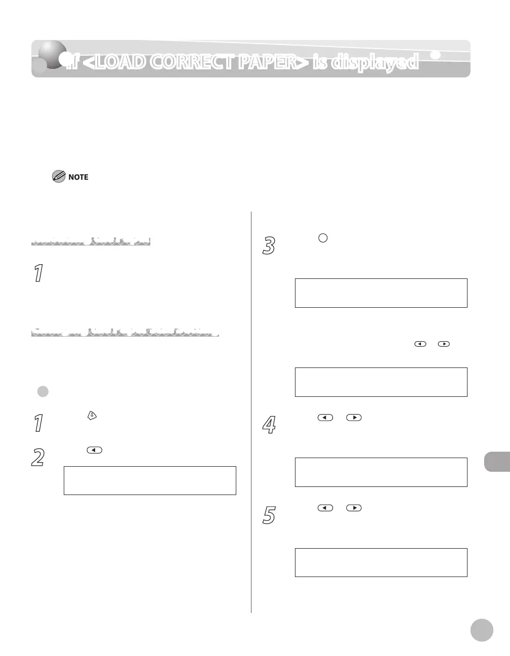 When <LOAD CORRECT PAPER> appears on the display, the size of the paper in the paper