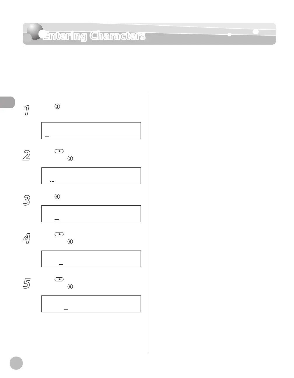 Example: Enter <Canon>. For details on entering characters, see “Register User Telephone