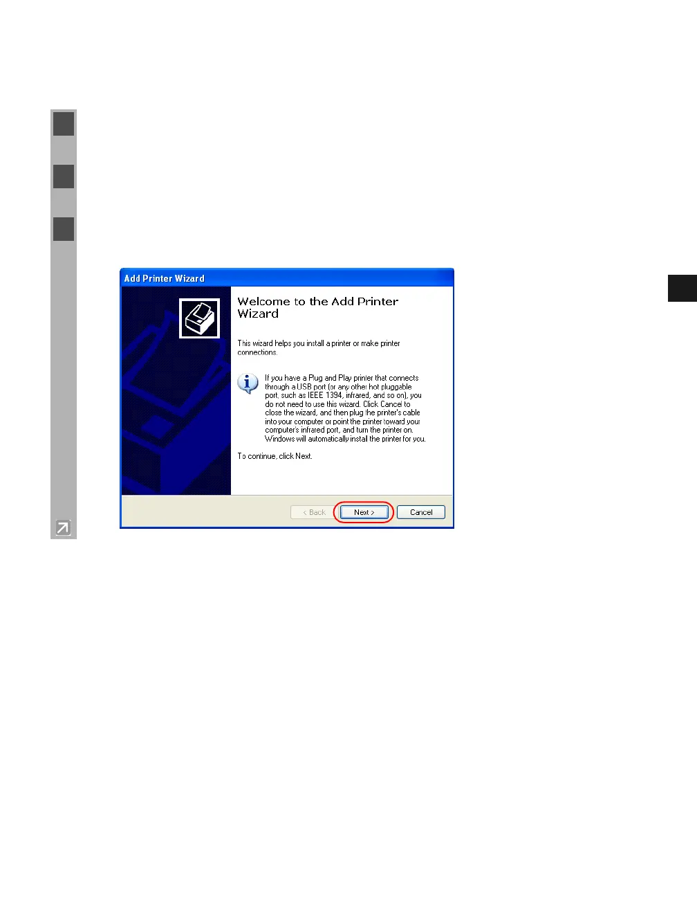 The following is the installation procedure of Add Printer Wizard, under Windows XP.
