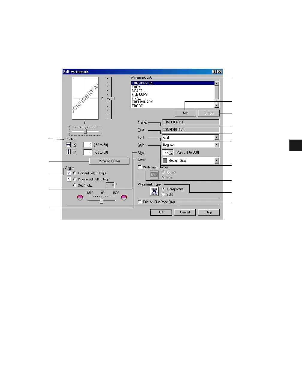 (4) Position lets you set the position where the watermark is printed on each page. To set the