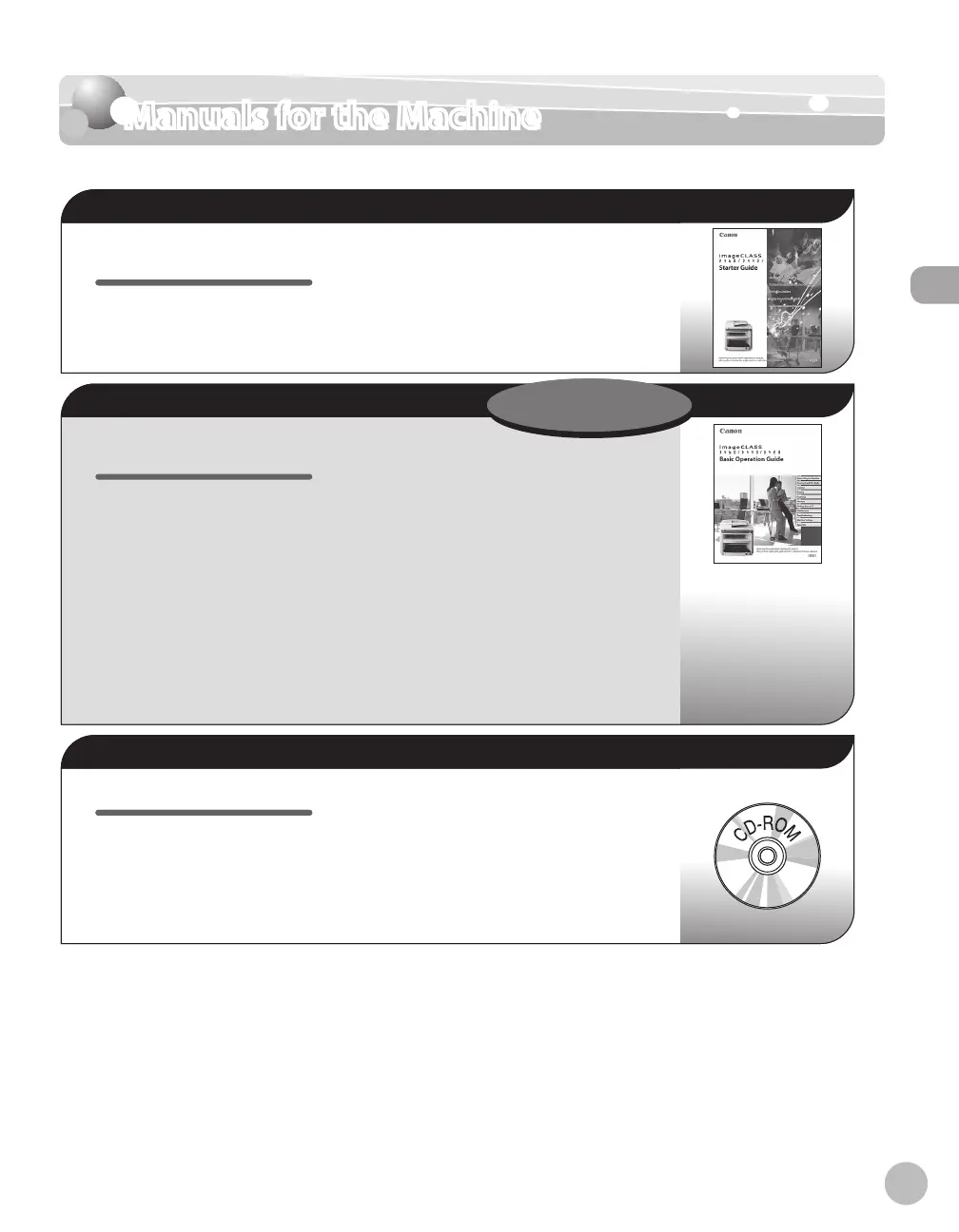 The manuals for this machine are divided as follows. Please refer to them for detailed information.