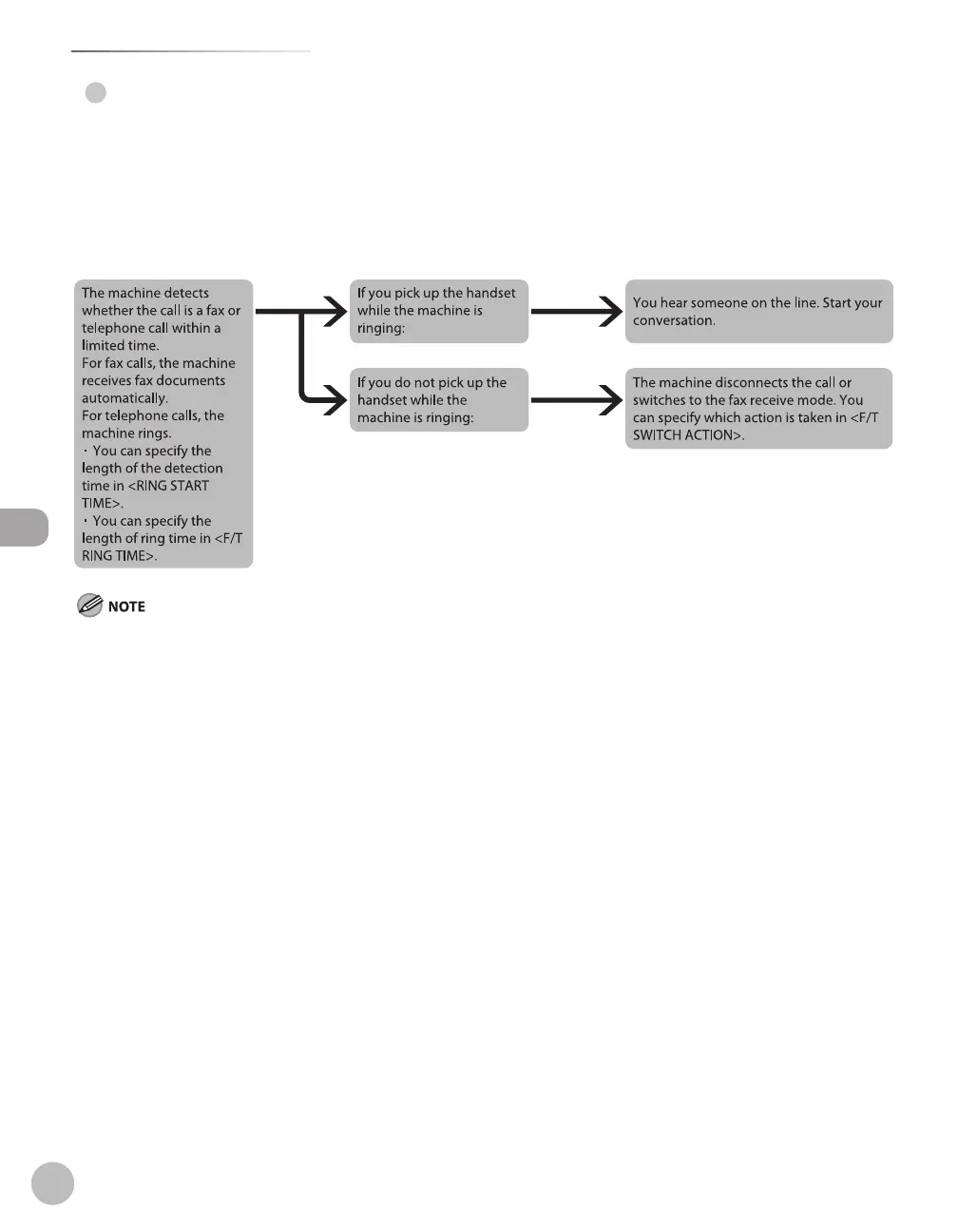 If you want to change <RING START TIME>, <F/T RING TIME>, or <F/T SWITCH ACTION>, see “Selecting the Receive Mode,” on p. 5-10.
