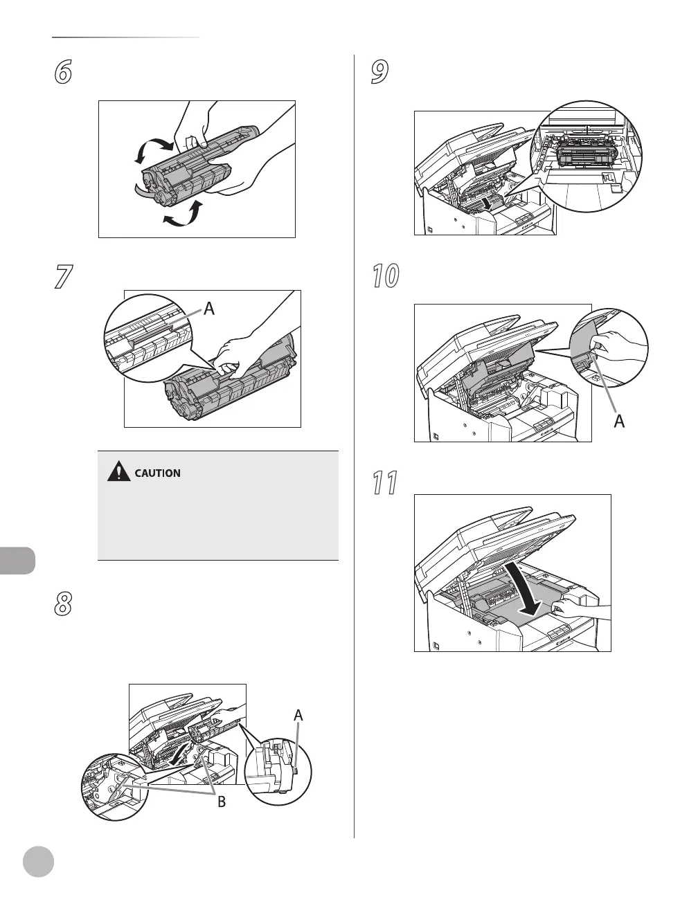 Hold the toner cartridge by its handle (A).