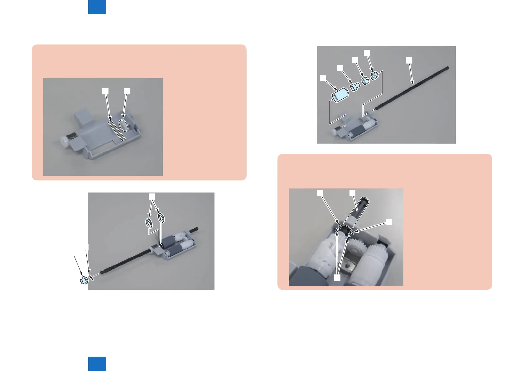 5)Pull out pickup roller shaft[1], and remove the pickup roller[2], bushing[A], bushing[B], and