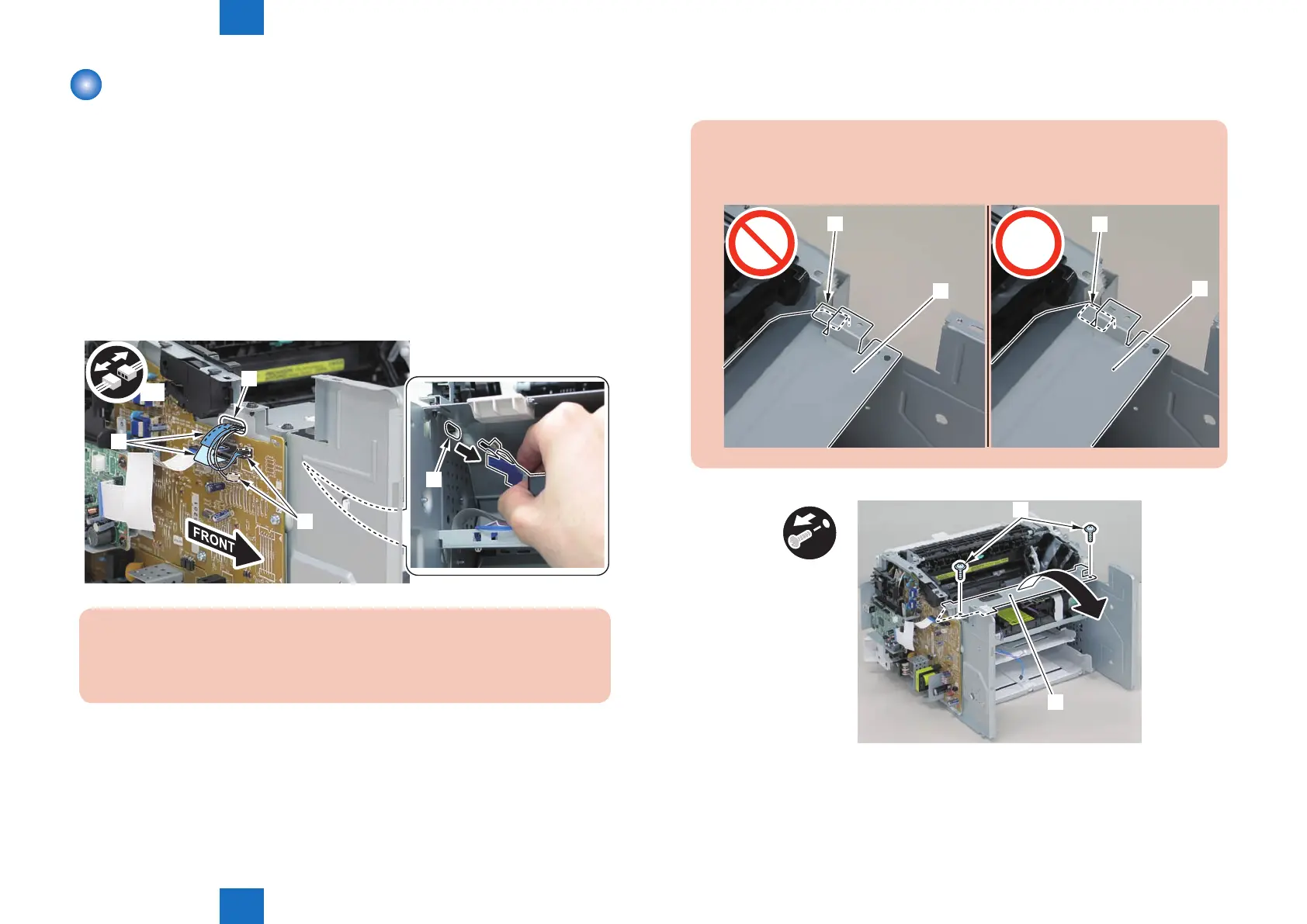 1) Remove the 2 connectors[1] and 2 at cables[2], and put them through the hole[A] of the