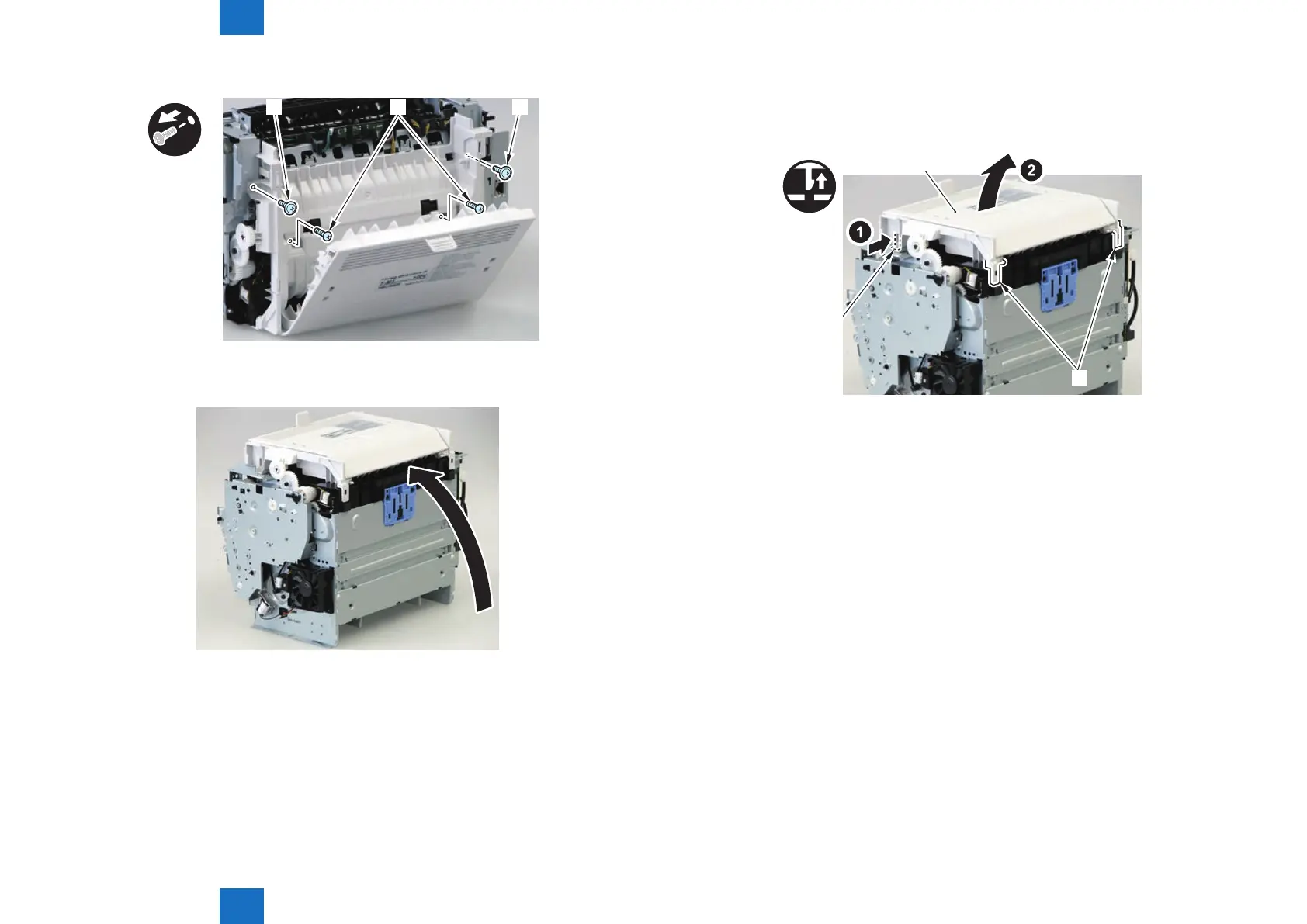 2) Remove the 2 screws (TP) [1] and 2 screws (tapping) [2] using a stubby screwdriver.