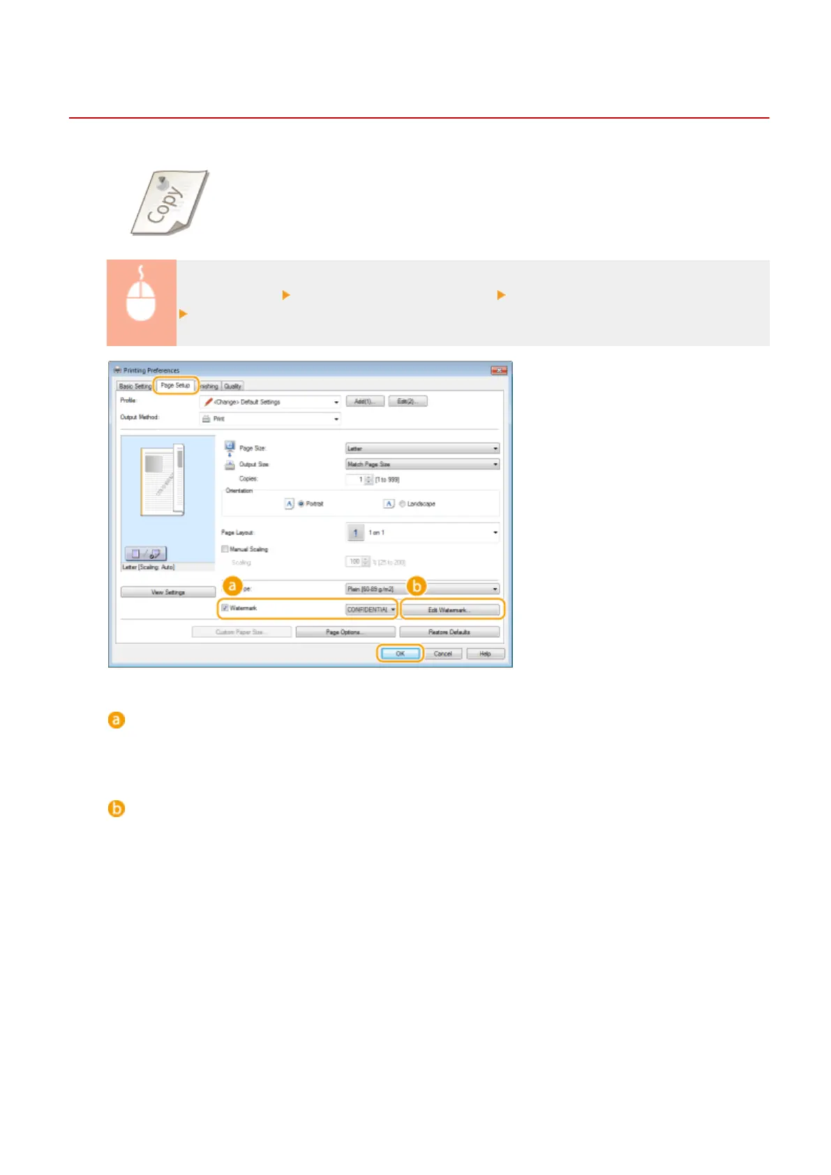 [Page Setup] tab Select the [Watermark] check box Select a watermark from the drop-down list