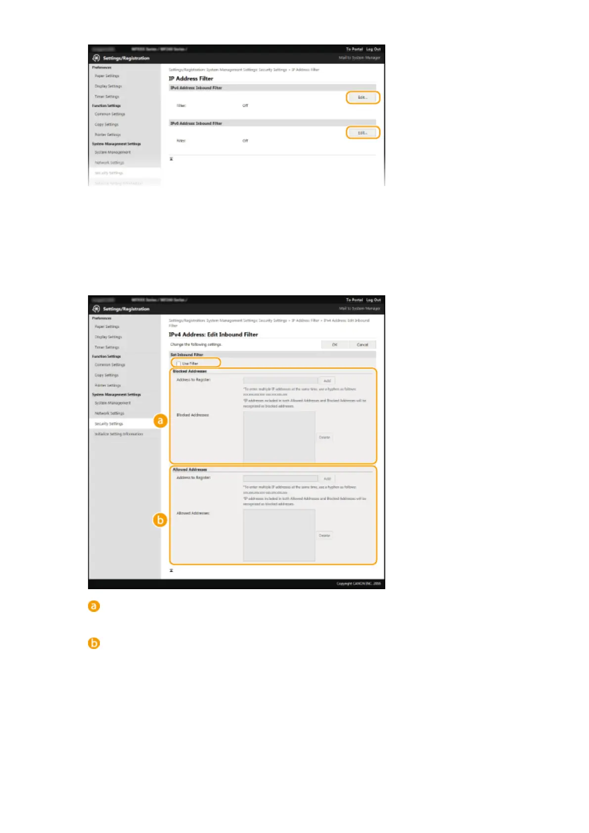 Select to restrict receiving data from the machine to a computer by specifying IPv6 addresses.