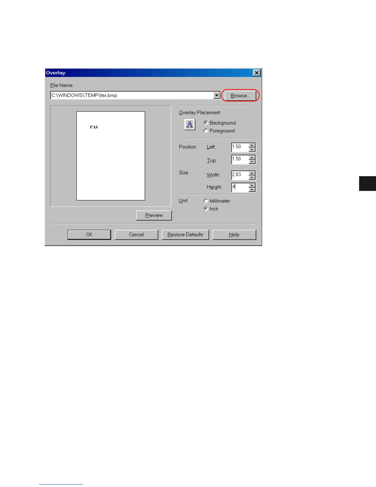 To make settings for overlay printing click Overlay... on the Page Setup tab. The Overlay