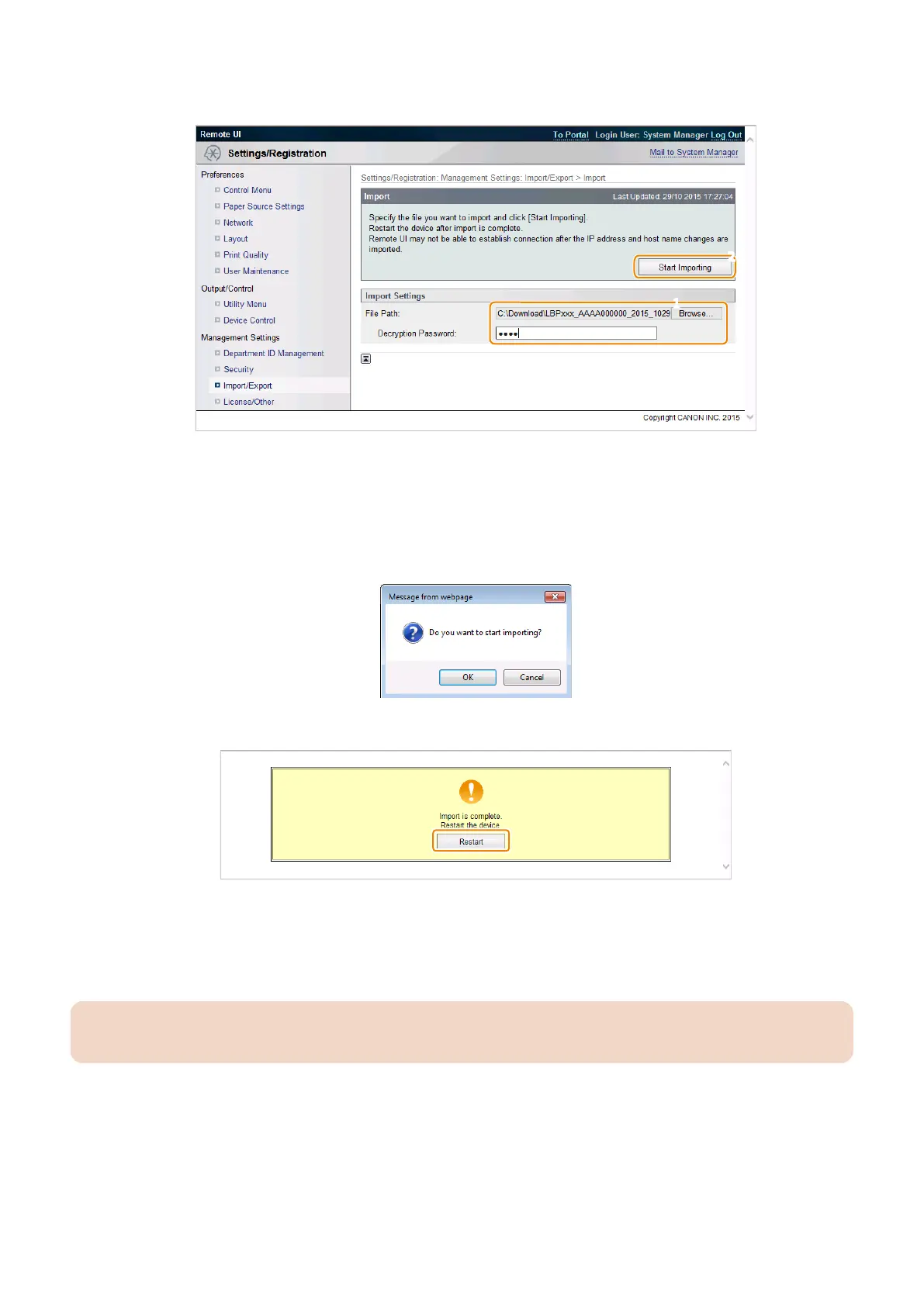 completes the procedure for importing a setting information file.