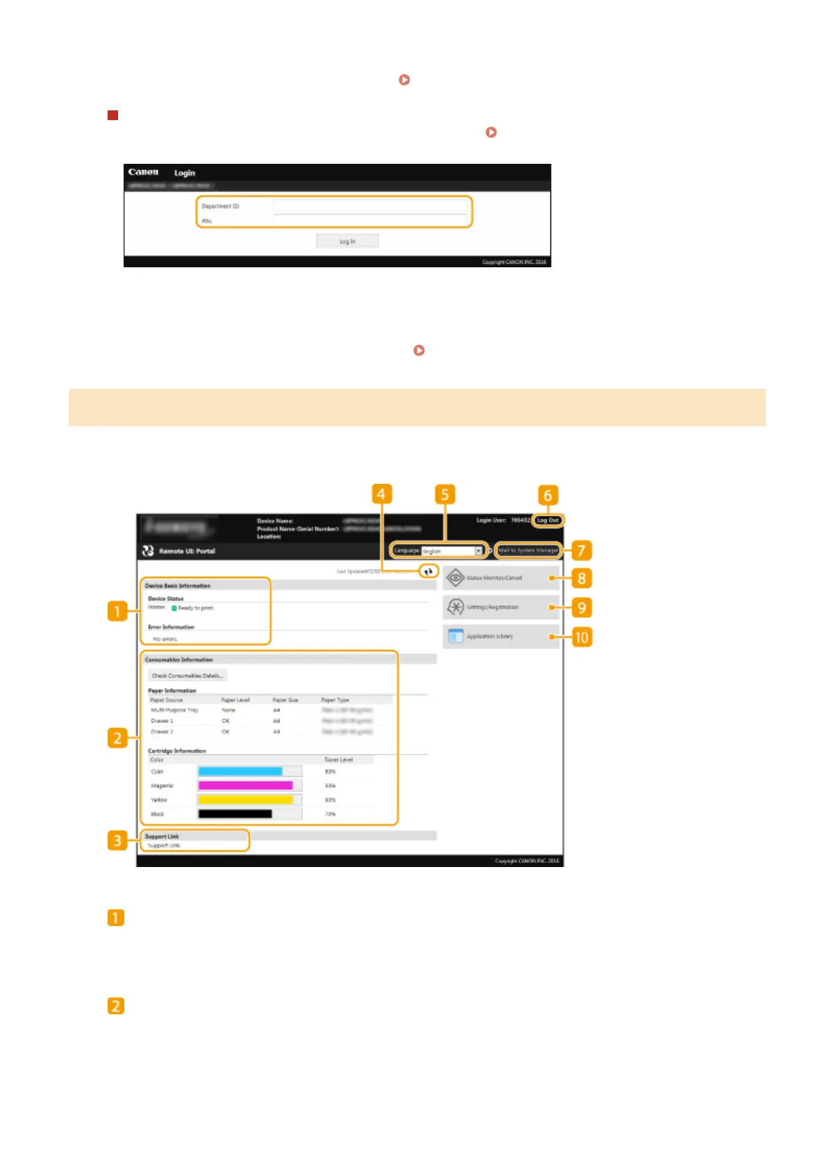 When you log in to the Remote UI, the following Portal page appears. This section describes the items displayed on