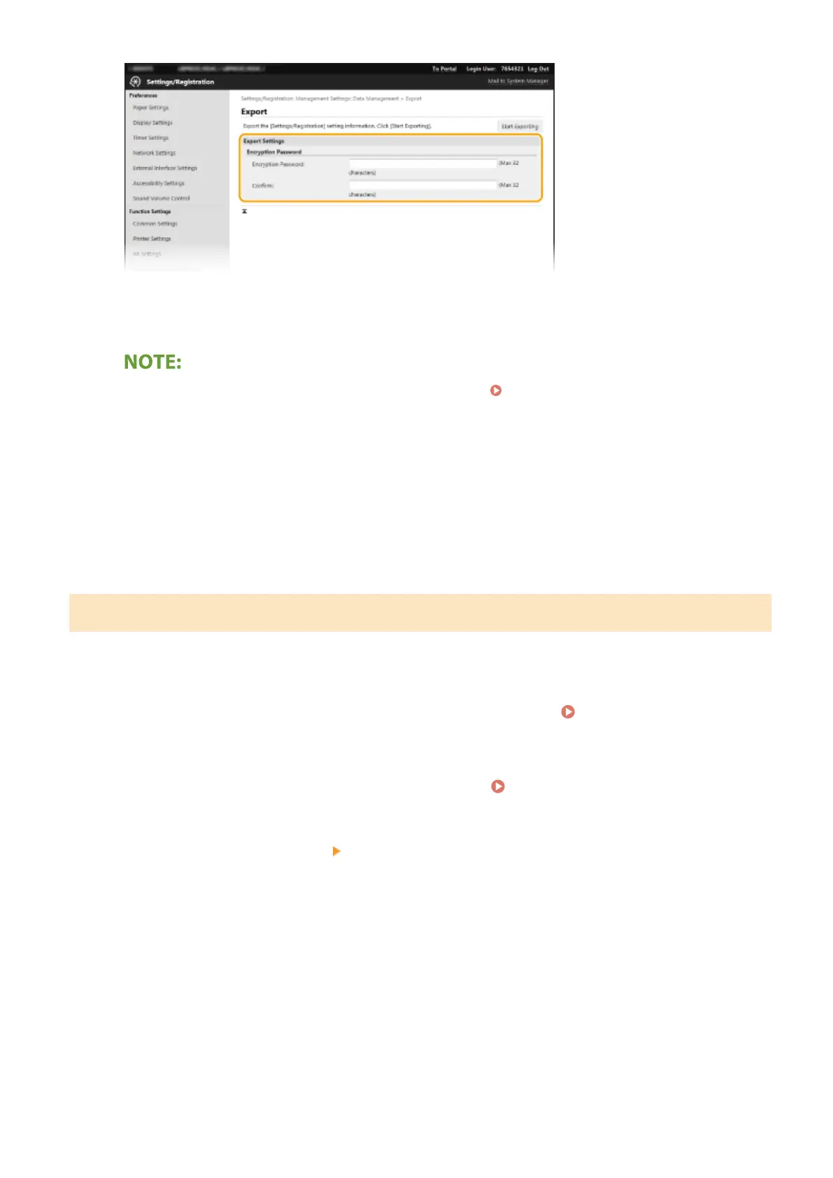 ● The password is required when exported data is imported. Importing the Setting Data(P. 287)