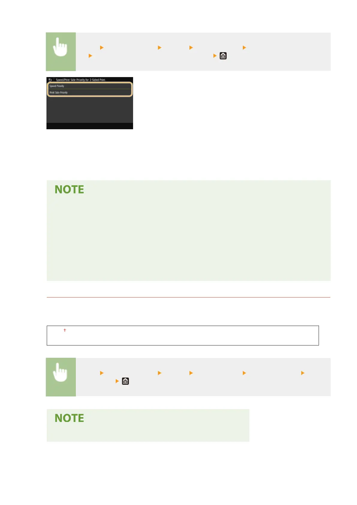 <Menu> <Function Settings> <Printer> <Printer Settings> <Speed/Prt. Side Priority for 2-