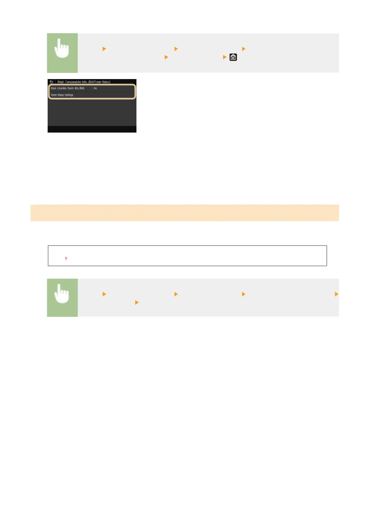If you do not want to use Toner Status, select <Off>. To prevent a button that accesses sites for purchasing