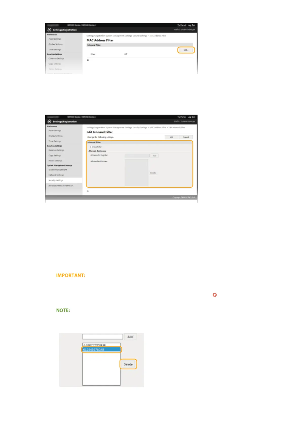 If MAC addresses are incorrectly entered, you may become unable to access the machine from the