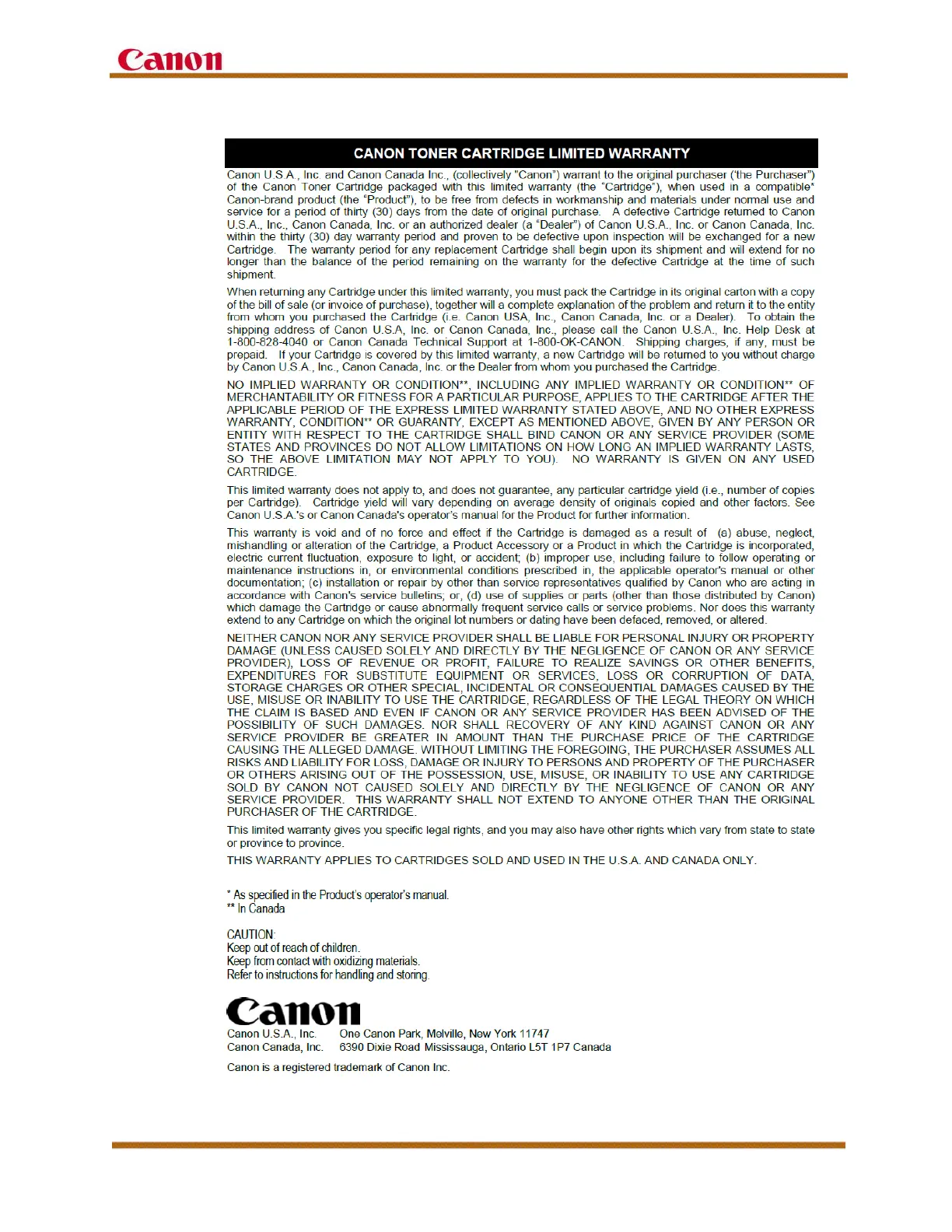 Canon imageCLASS MF236n - Canon Toner Cartridge Limited Warranty