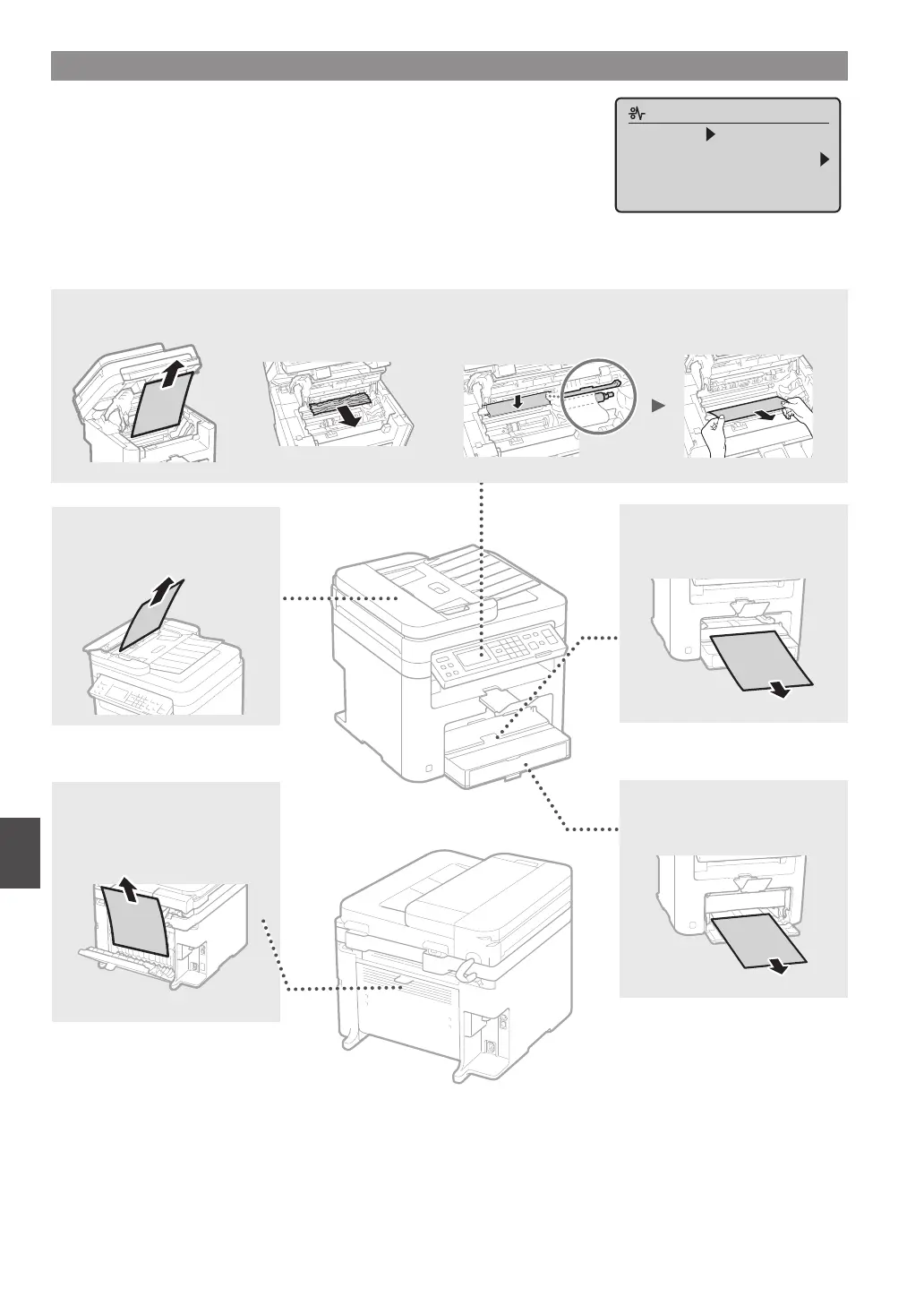 If the following screen appears, a paper jam has occurred inside the machine. Follow