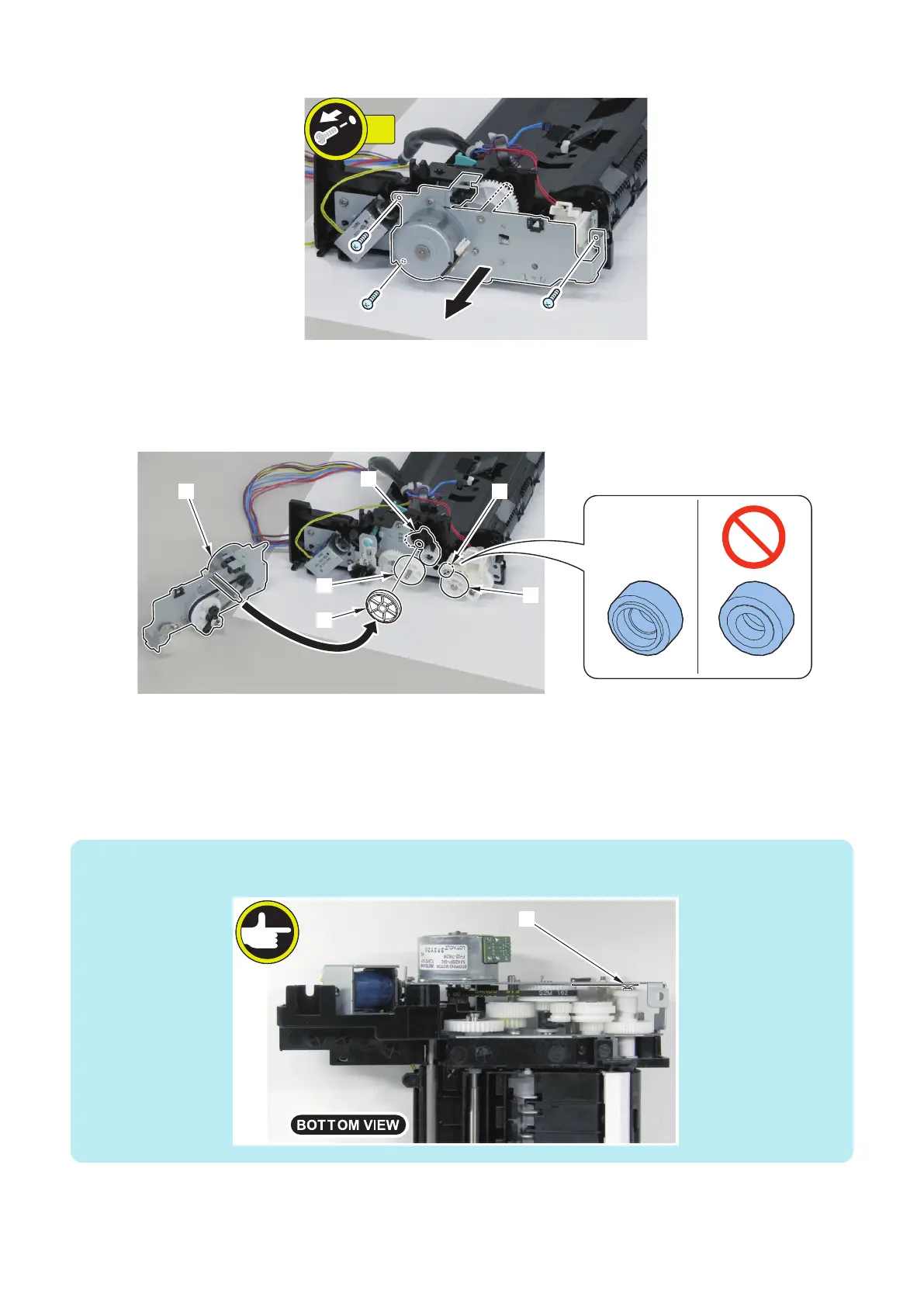 Ensure that the 1 point [A] in the DADF Pickup Unit and DADF Motor Unit are in contact with the edge of the shafts.