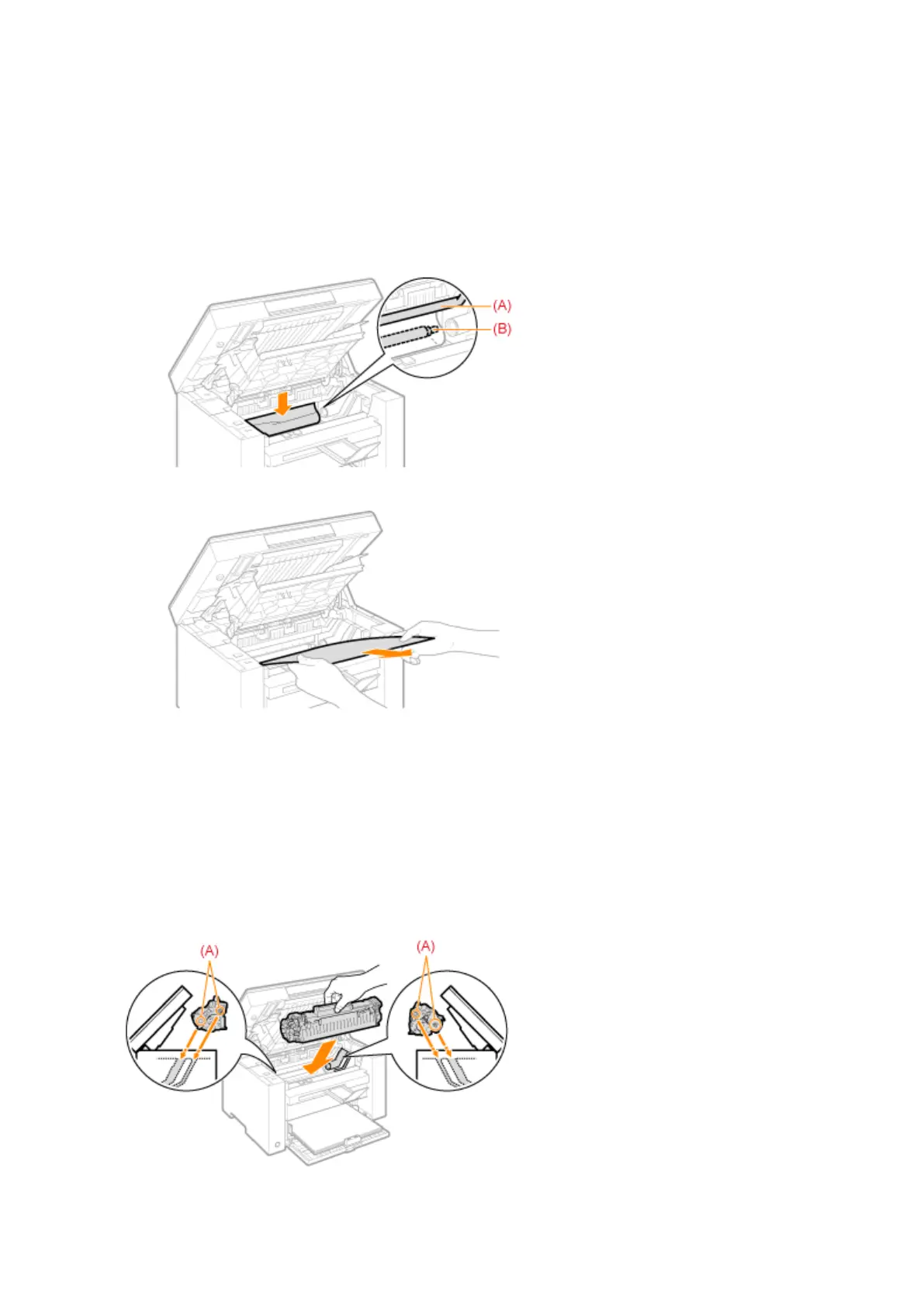 (1) Gently pull any jammed paper downward from the space between the xing unit (A) and r