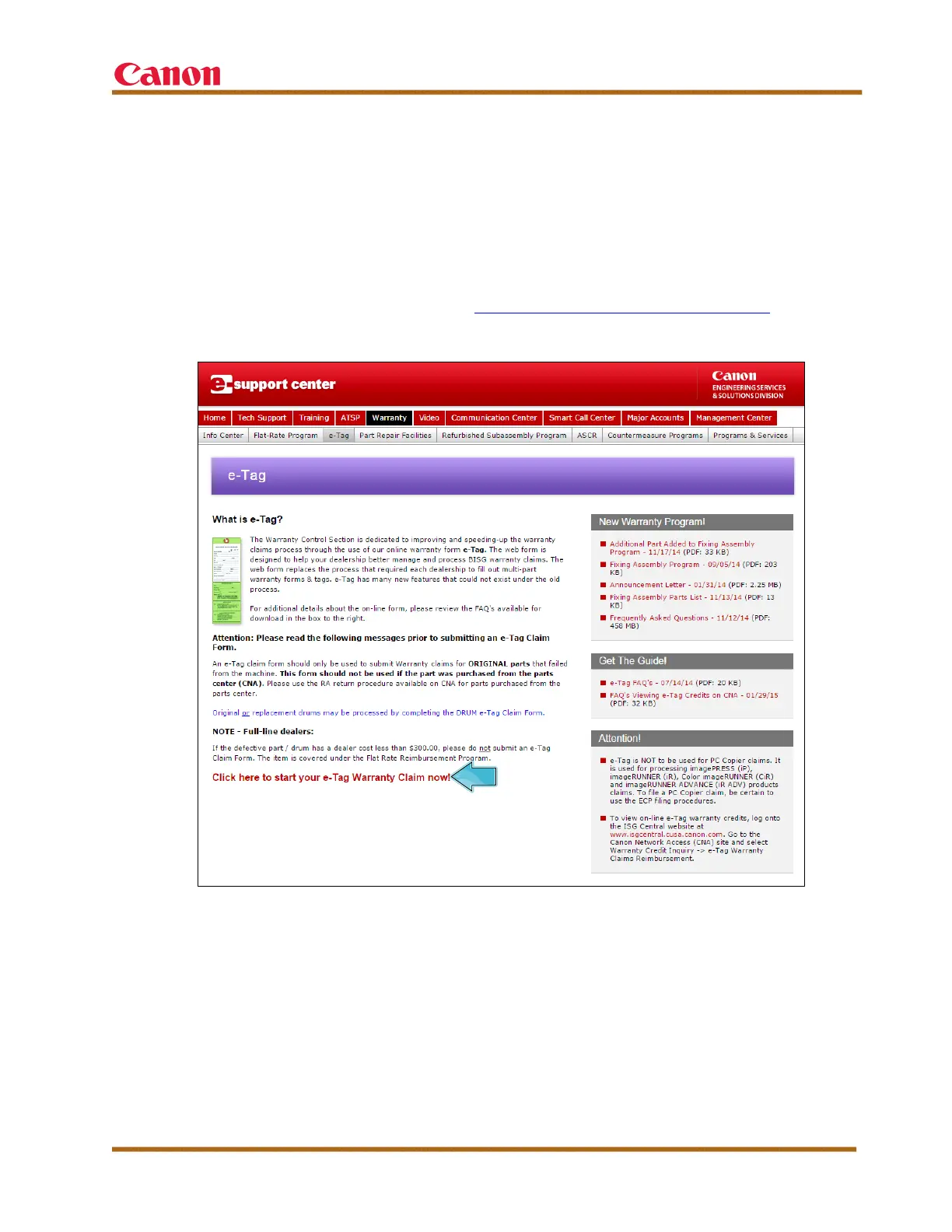 The e-Tag warranty claim form can be accessed in the Warranty section of