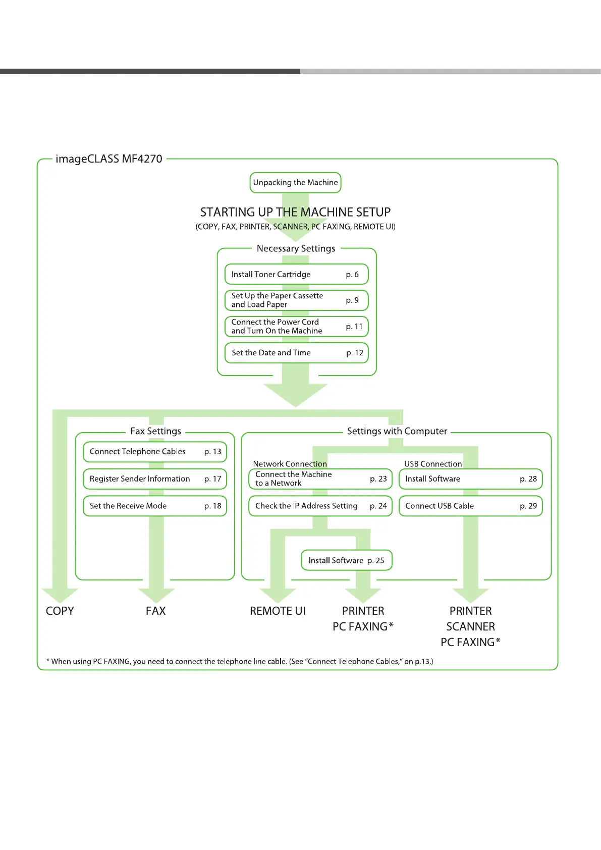 For example, when you use copy function only, follow “Necessary Settings”. When you use both copy and fax