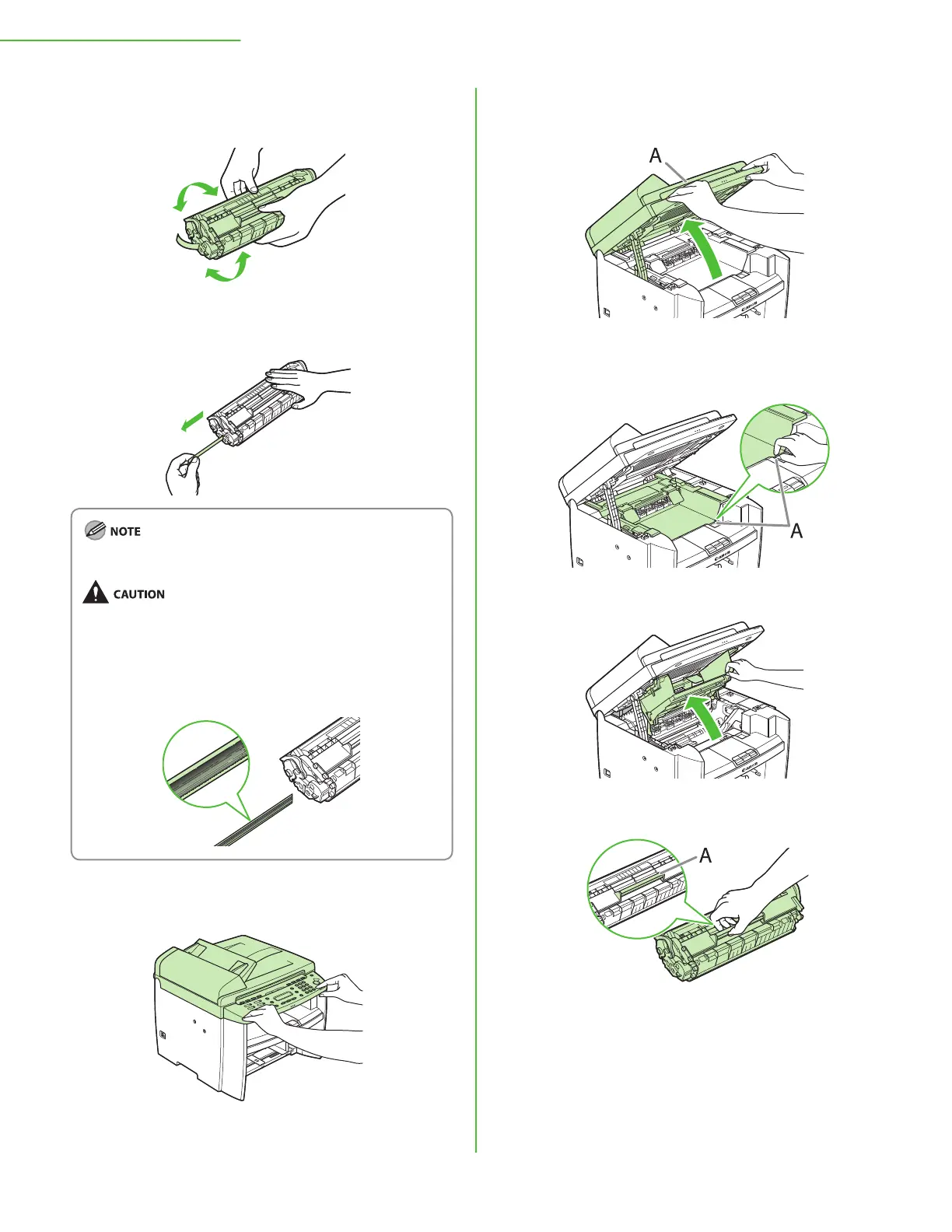 9 Hold the toner cartridge by its handle (A).