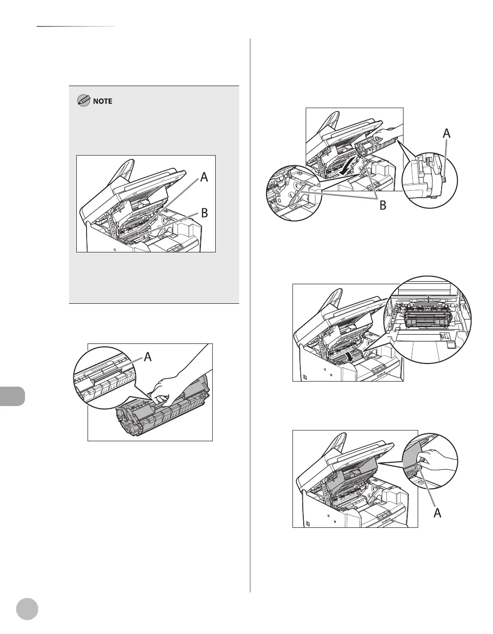 Hold the toner cartridge by its handle (A).