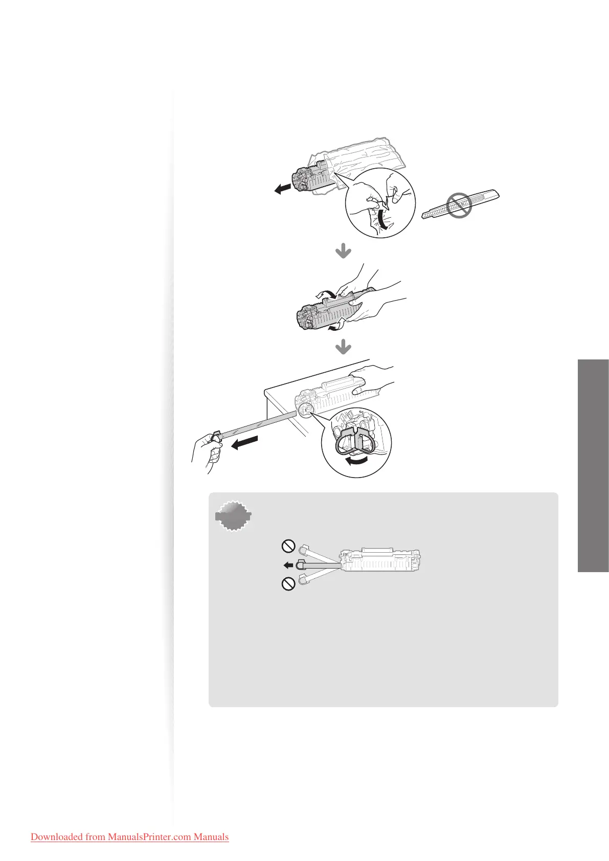 • Even if the sealing tape stops at midpoint, pull it out of the toner