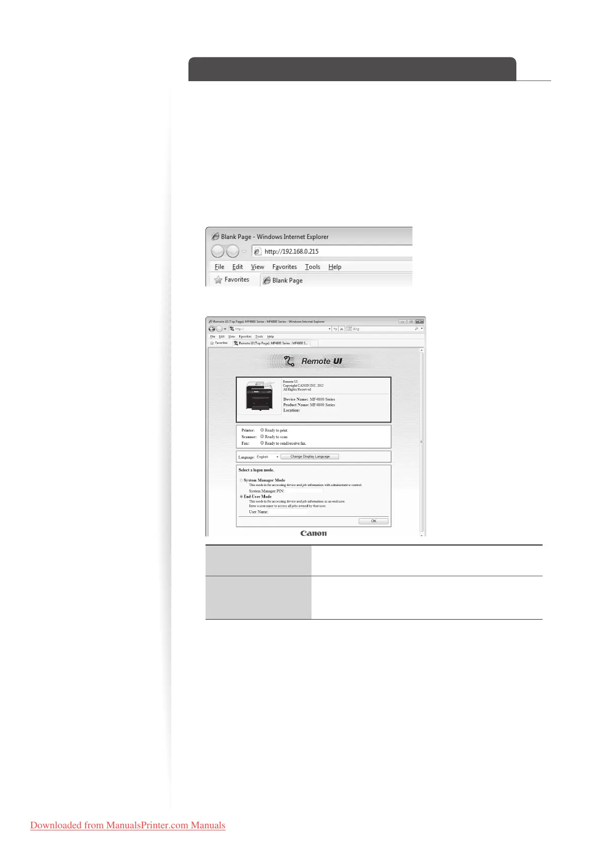 Start the web browser, enter “http://<the IP address of the machine>/” in