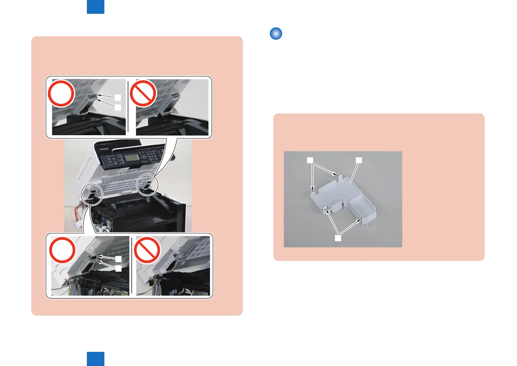 When installing the DADF unit and reader unit, secure the 2 hinge arm claws[1] to