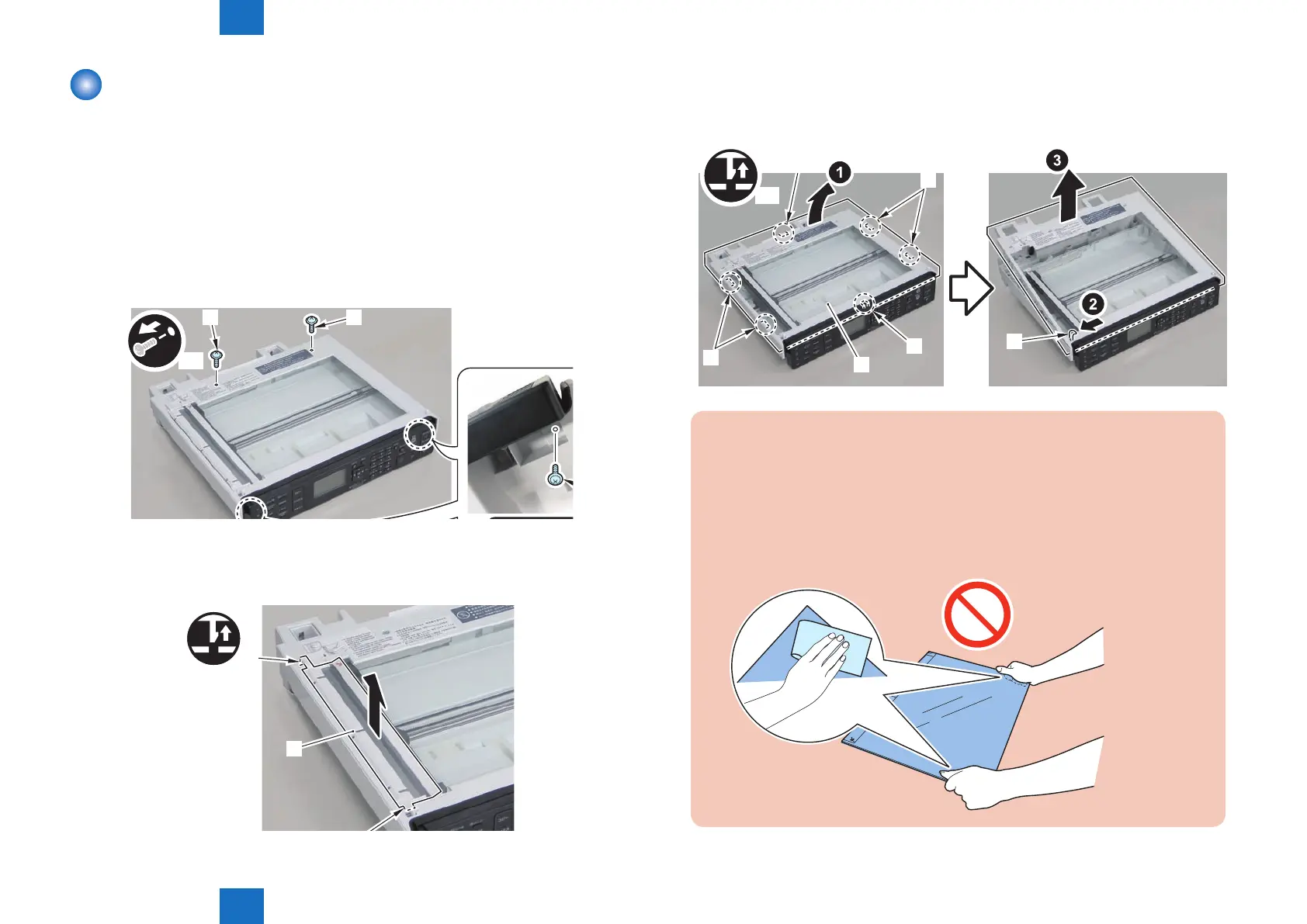 Disassembly/Assembly > Document Exposure/Feeder System > Removing the Copyboard Glass(MF4890dw/MF4880dw) > Procedure