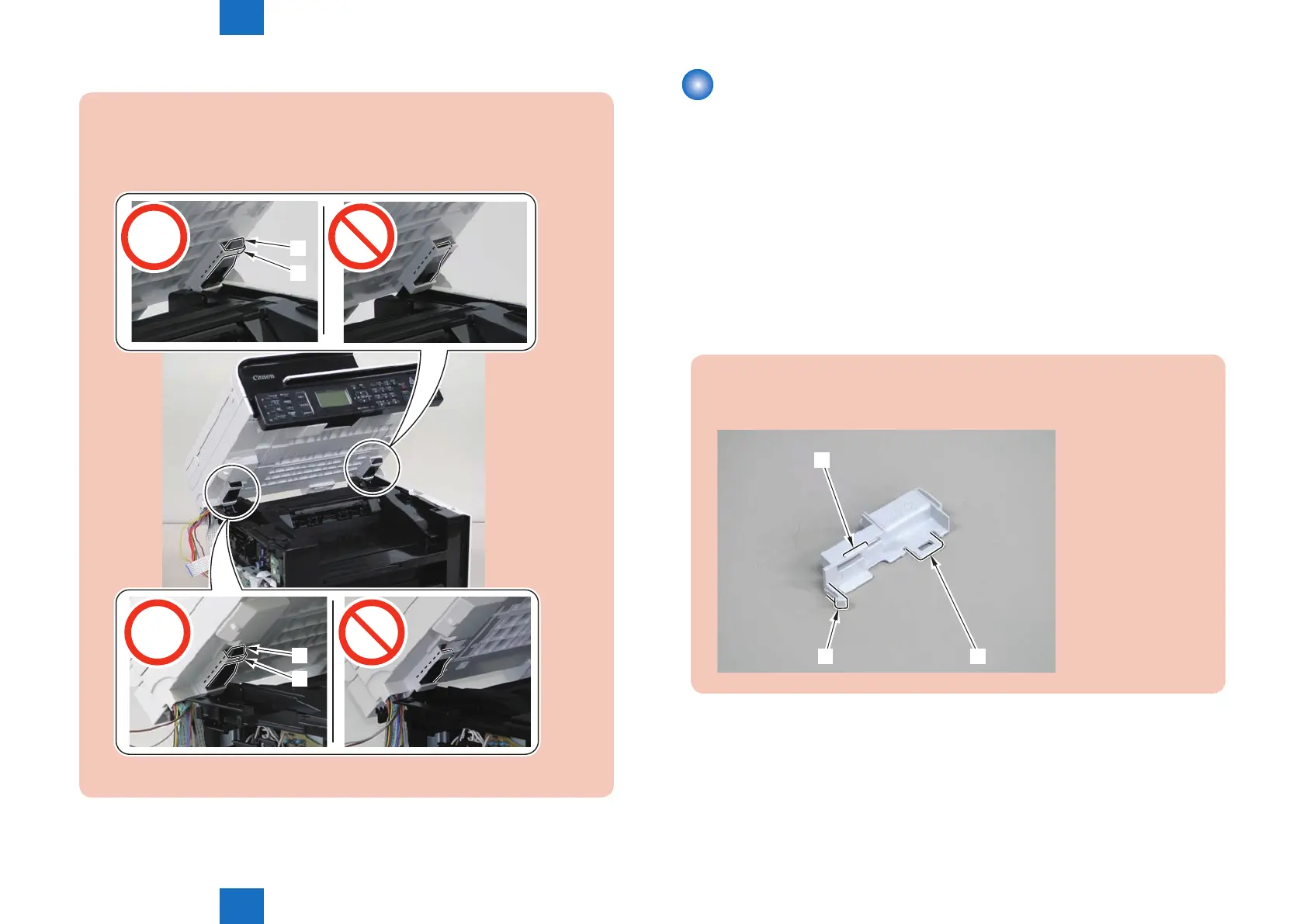 When installing the DADF unit and reader unit, secure the 2 hinge arm claws[1] to