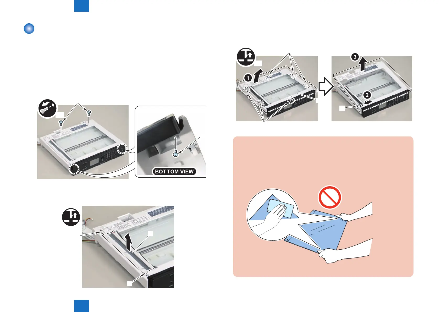 Disassembly/Assembly > Document Exposure/Feeder System > Removing the Copyboard Glass(MF4780w/MF4770n/MF4750/MF4730) > Procedure