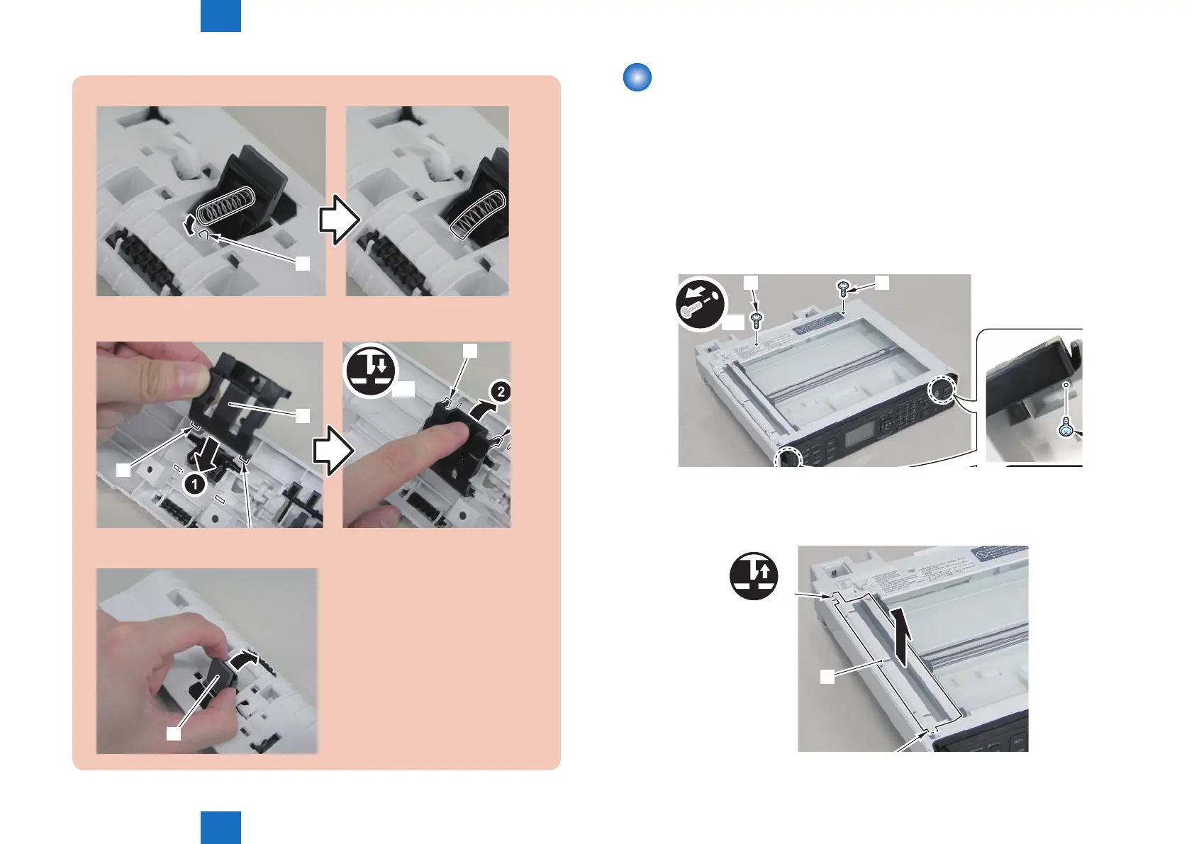 3)Install the spring to the protrusion[1] of the DADF pickup upper cover.