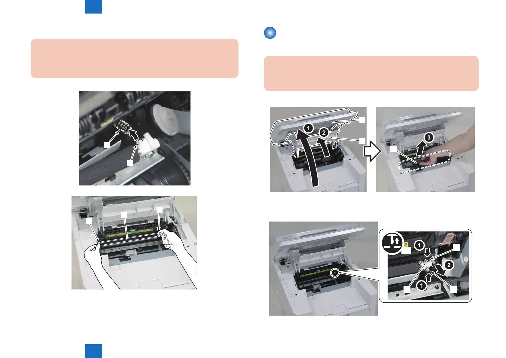 3) Hold both shafts [1] of the transfer roller and remove the roller [2].