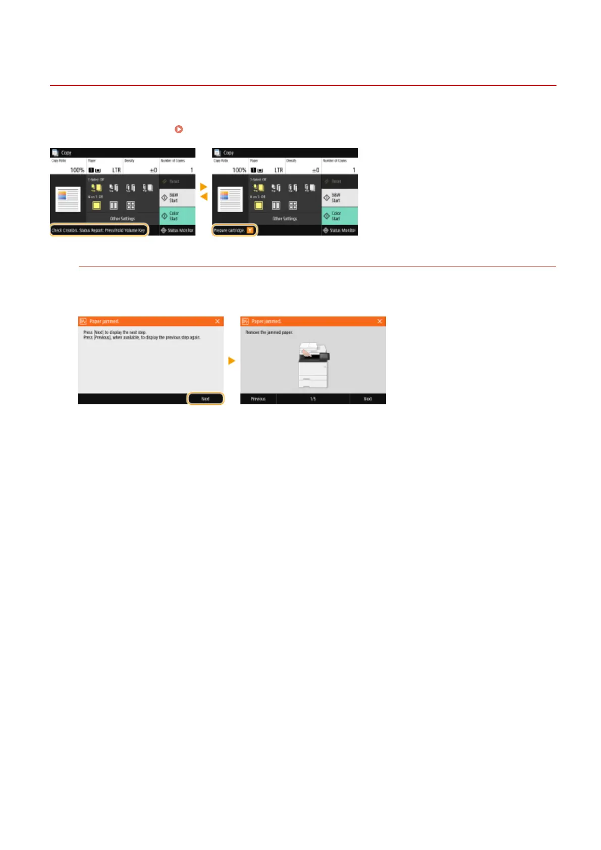 screen instructions to solve the problem. The screen displayed when a paper jam occurs is shown below as an