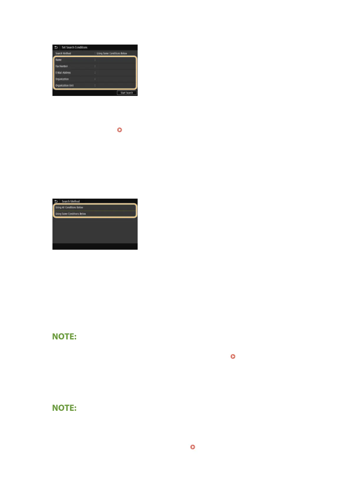 ● Name, fax numbers, e-mail addresses, organization names, and organization unit are available criteria for