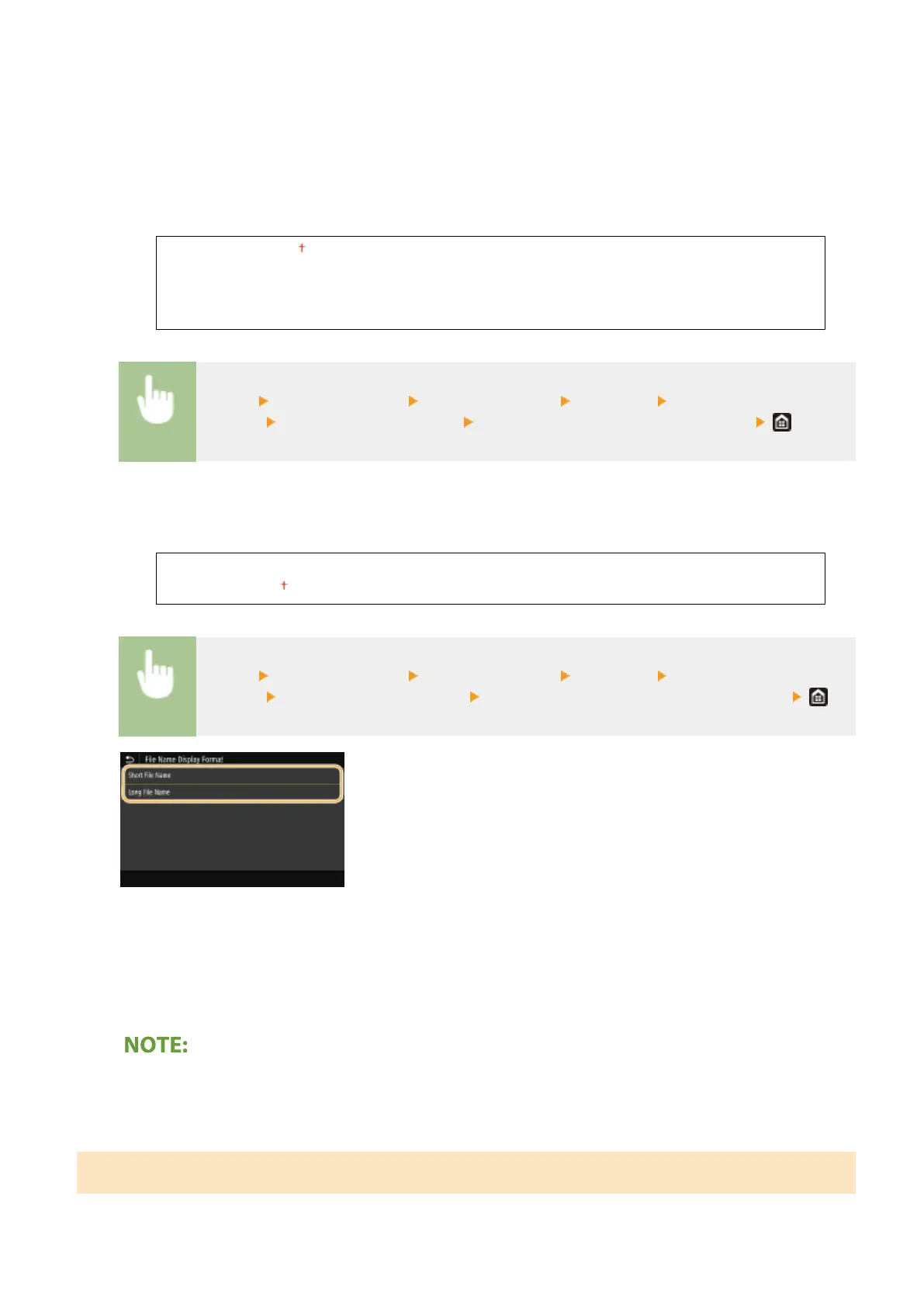 Settings> <File Name Display Format> Select <Short File Name> or <Long File Name>