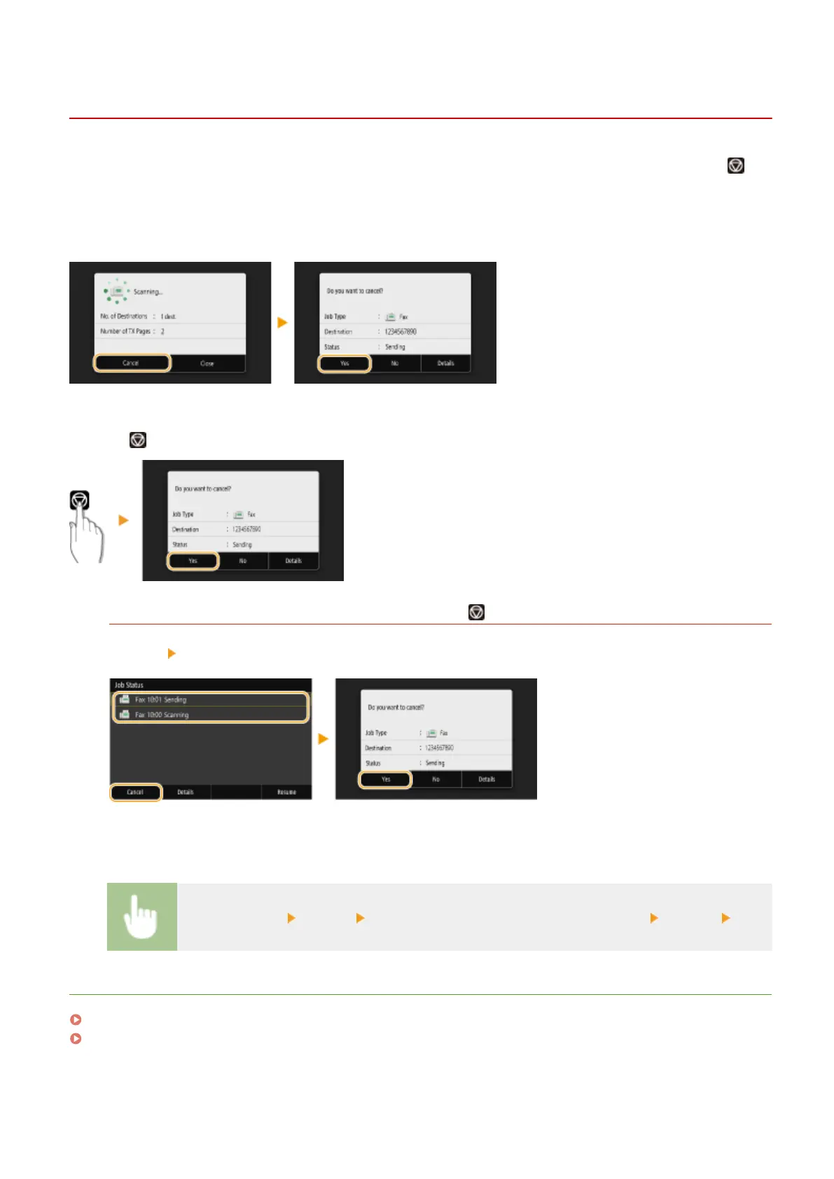 <Status Monitor> <TX Job> Select the document in the <TX Job Status> tab <Cancel> <Yes>