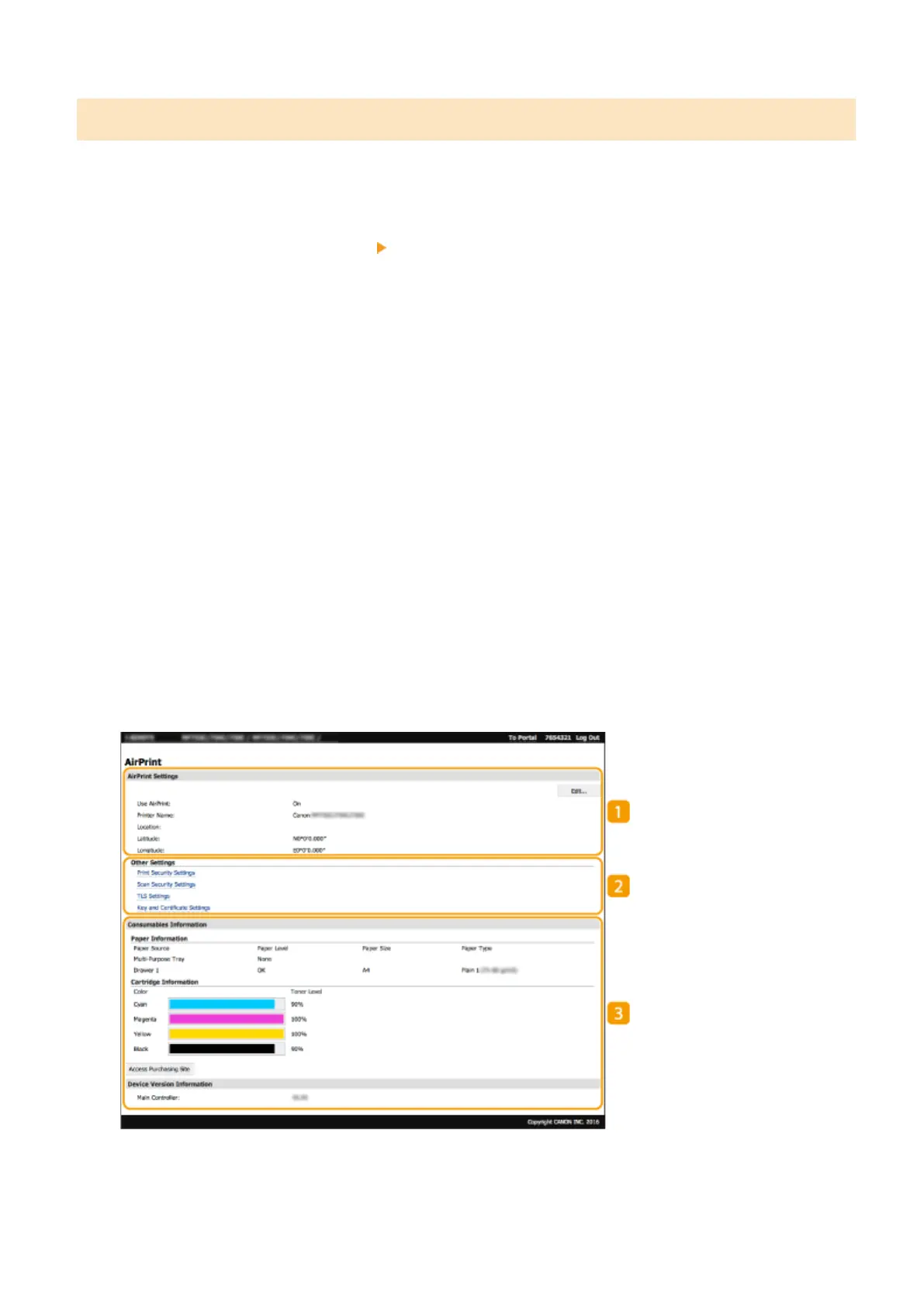 When you log in with administrator privileges, the AirPrint-dedicated page is displayed as shown below.