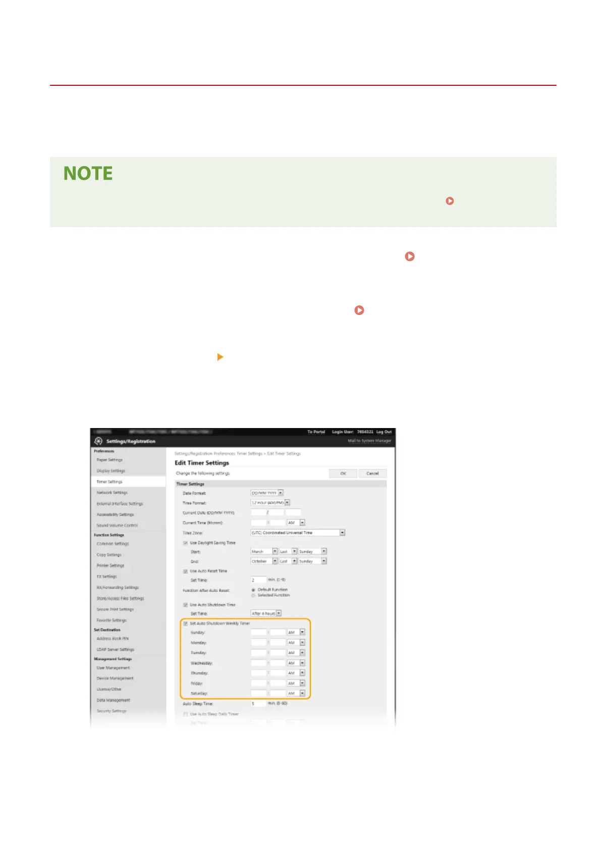 Select the check box for [Set Auto Shutdown Weekly Timer], and set the time to turn