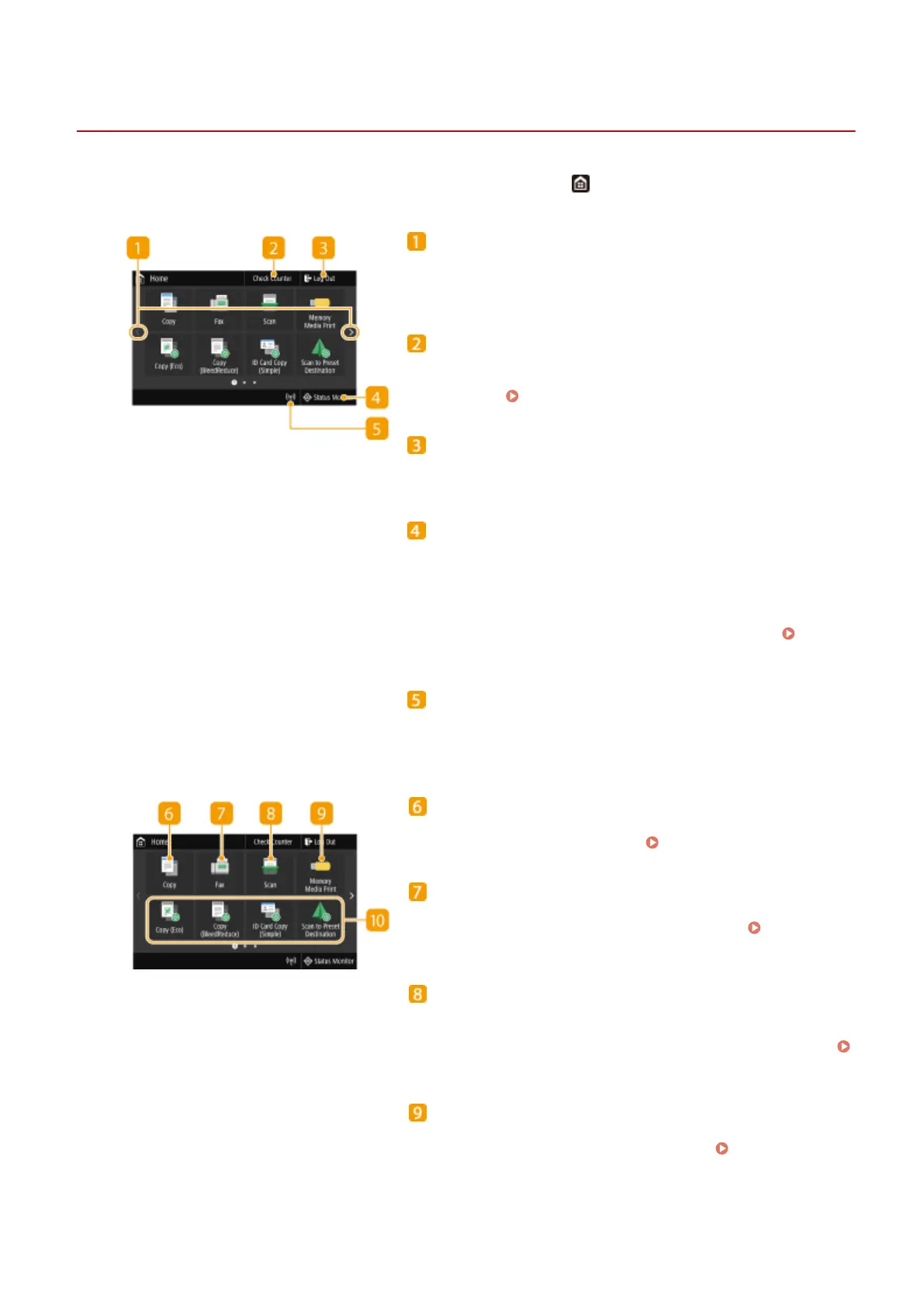 The Home screen is displayed when the power is turned ON or by pressing on the operation panel. Use this screen