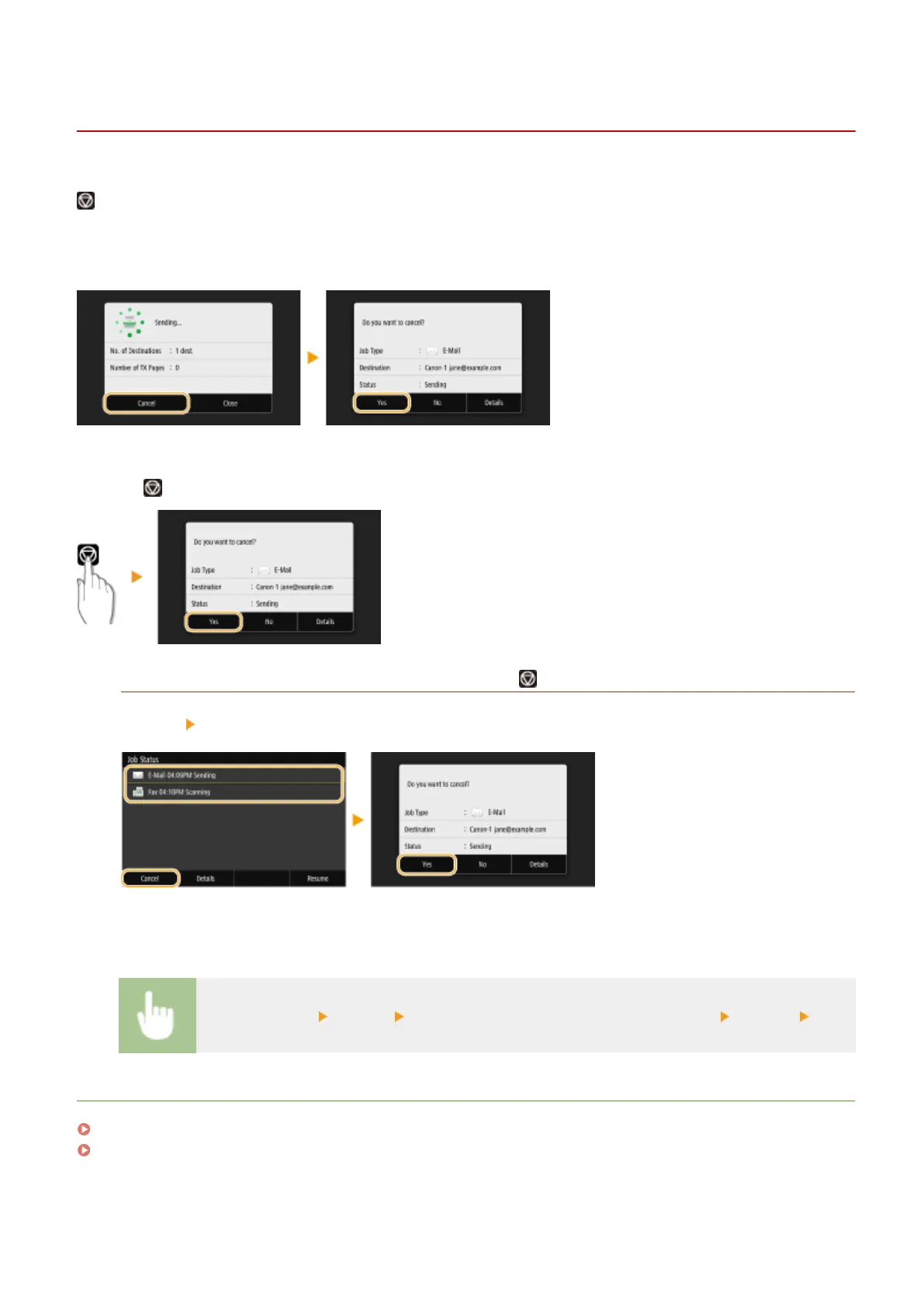 <Status Monitor> <TX Job> Select the document in the <TX Job Status> tab <Cancel> <Yes>