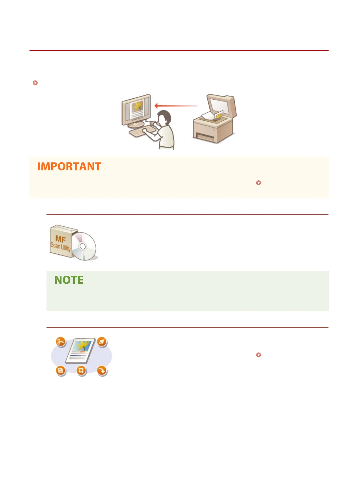 To scan from a computer, you can use MF Scan Utility or an application such as an image processing or word