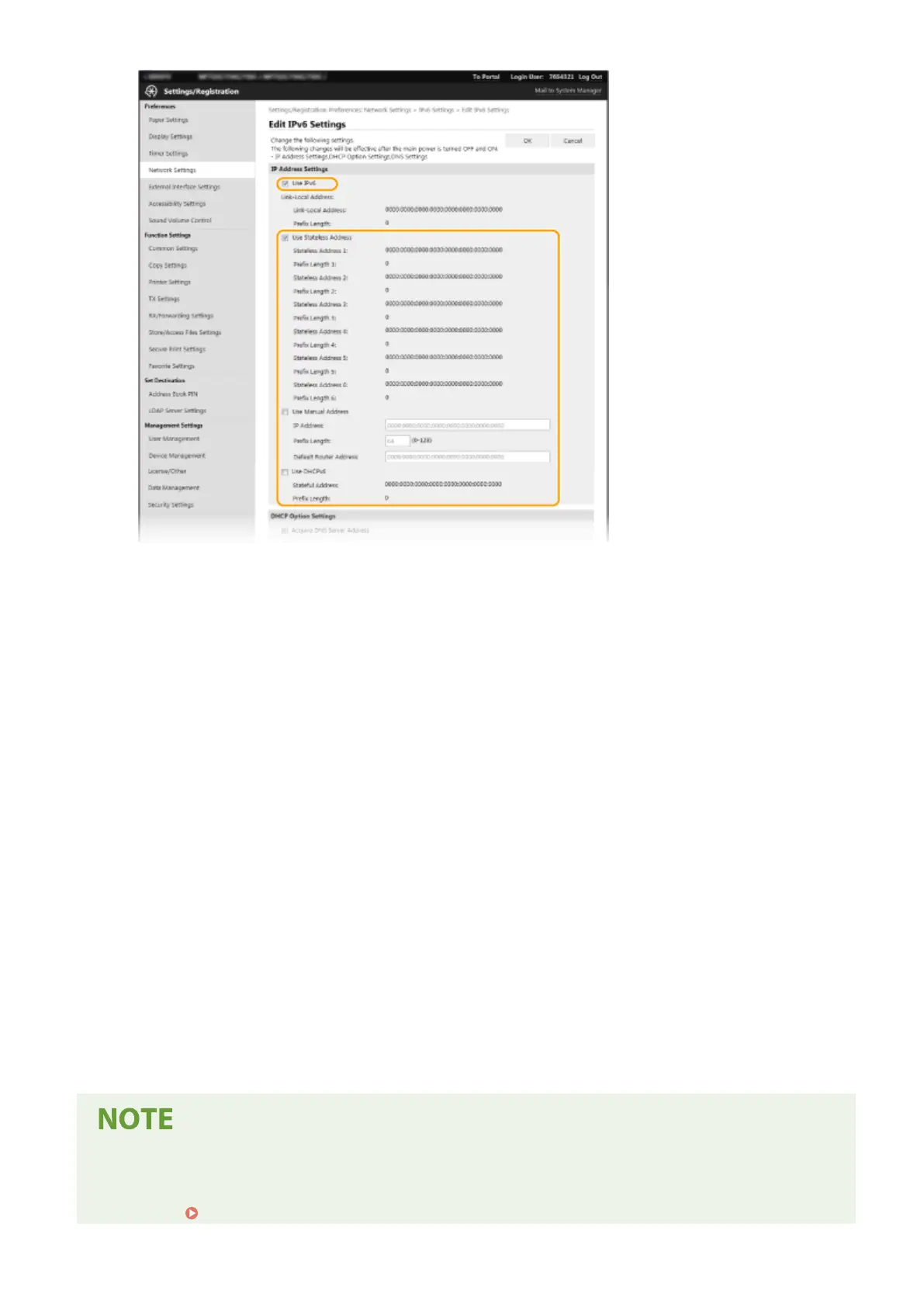 Select the check box to enable IPv6 on the machine. When not using IPv6, clear the check box.